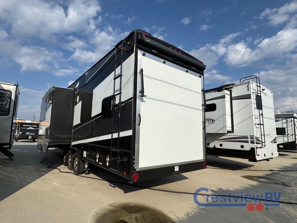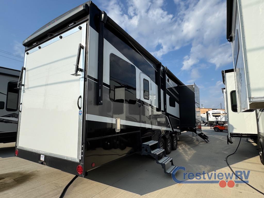 Dutchmen Voltage toy hauler 4145 highlights: Full and Half Bath Twin-Size Loft Master Suite 13' Separate Garage Outside Kitchen Exterior Entertainment This Voltage toy hauler has so much to offer! From the king-size bed, Happi-Jack power bunk, and twin-size loft to the fireplace, residential sofa with heat and massage, and two entry doors, you will find convenience and comfort all throughout. The kitchen is decked out with helpful amenities, like an oversized convection microwave, a stainless steel farmer's sink, a Furrion three-burner range with 21" oven, and a peninsula countertop. One other feature that is going to make this unit extremely desirable is the full and half bathroom. The full dual-entry bathroom resides up at the front connected to the bedroom, and the half bathroom is located back within the garage so that you can offer this space as a guest suite to your friends. Plus, on top of all of that, there is also an outdoor kitchen and entertainment center so that you can increase the party atmosphere. You will be extremely impressed by the amount of luxury found on the Dutchmen Voltage fifth wheel toy hauler! Some of the premium features that you will find on the Voltage are the Zero-Gravity ramp door that lets you access your toys with very little effort and the king-size bed which offers you extra space for sleeping comfortably. The Voltage also has industry-leading 7'-tall slides so that you can feel free to stretch your legs while inside. The ramp door patio system is certainly going to be an appealing factor because it provides you with an extra party space, and the dedicated heat ducts for the underbelly and the All-Weather Package with additional insulation will ensure that your Voltage is protected and prepared for all sorts of weather.