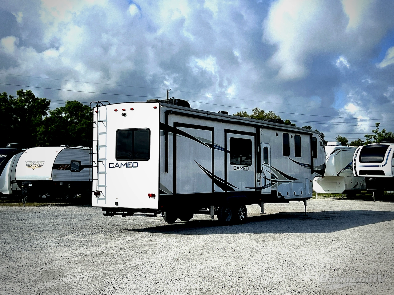 CrossRoads RV Cameo fifth wheel CE3975CK highlights: Rear Kitchen, Dual-Sink Vanity, Tri-Fold Sofa, Theater Seats, Two Awnings, Master Suite. You might just decide to become a full-timer after one trip with this Cameo fifth wheel which includes a separate rear kitchen with a residential refrigerator, lots of counter space, and everything you will need to enjoy making meals for your family or friends. The living area is centrally located so that you can grab your food and dine at the free-standing dinette or relax on the tri-fold sofa and theater seats all while enjoying the fireplace and entertainment center. Storage is found throughout the interior with the entryway closet and the ample bathroom storage. Plus, the bathroom also has double sinks, a shower with a seat, and a private entry into the bedroom for those nighttime trips. Your spacious bedroom offers a king bed slide, another fireplace, and a large front closet that has been prepped for a washer and dryer. The CrossRoads Cameo fifth wheel has had many years of experience providing customers with luxurious, prestigious, and residential getaways!
