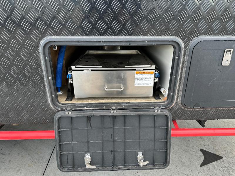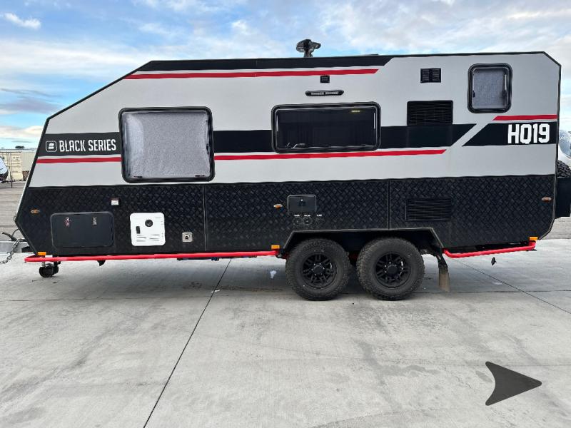 Black Series Camper HQ Series travel trailer HQ19 highlights: Rear Bathroom, Front RV Queen Bed, Full Fiberglass Shower, Large Pass-Through Storage, 6-Cubic Foot Refrigerator. Taking this HQ Series travel trailer out for a spin will be oh-so fun! This flagship model showcases the most luxurious design in the whole series, and you will absolutely love spending your time in this trailer because of the serene and beautiful interior décor. At the front, you will find your own RV queen bed where you can lounge, relax, and sleep in peace, and when you walk to the back of this trailer, you will find a bathroom complete with a full fiberglass shower, porcelain toilet, vanity, and washer for your clothes! After you make a hot cup of coffee, sit down with a good book at the convertible lounge with up-down table. You can also use this lounge as a sleeping space at night. The Black Series Camper HQ Series travel trailers are one-of-a-kind! You won't find many more trailers like these out on the market. Built for the extreme camping enthusiast, the HQ Series is off-road and off-grid friendly. These rugged trailers have aluminum composite panels with added aluminum diamond plating for added strength and a stone guard/skid guard that adds protection for the bottom edge of the trailer. The Eurovision windows have a fly screen and privacy shades, and there is also a tri-lock security door with locking fly screen. An amazing feature that comes on each of the models is the outdoor kitchen which has a stainless steel sink slide, a propane stove, and a large prep table, and the roof-mounted solar panels are amazingly useful for those off-grid trips.