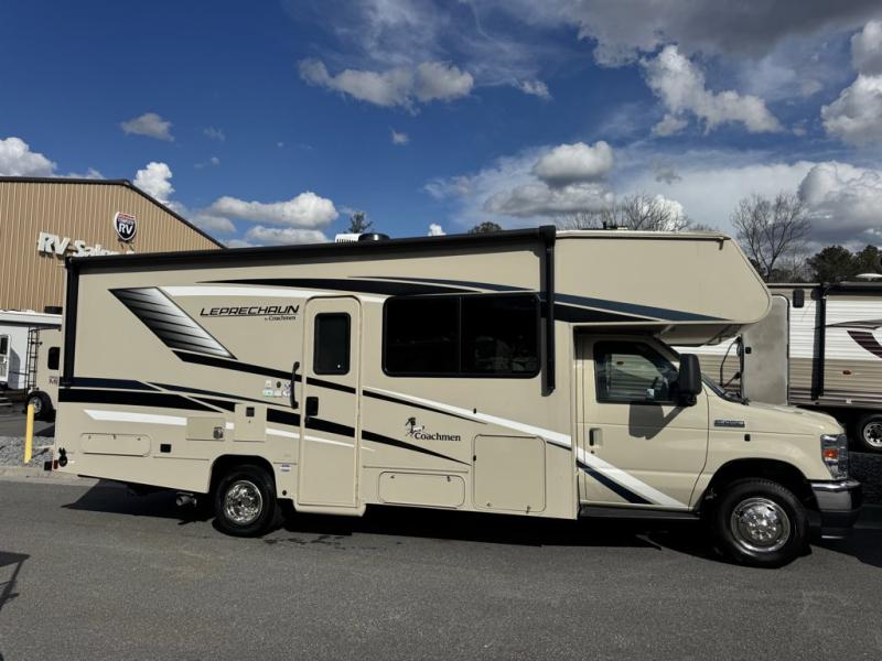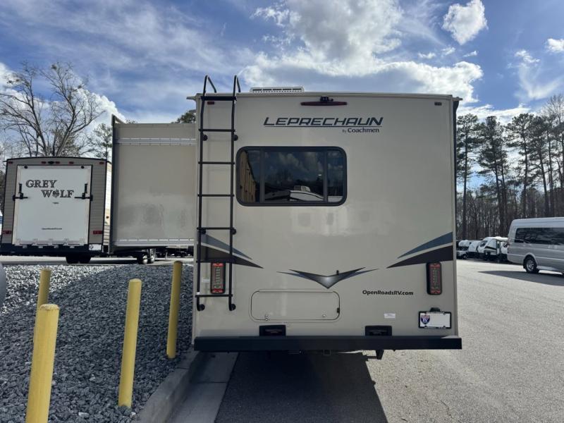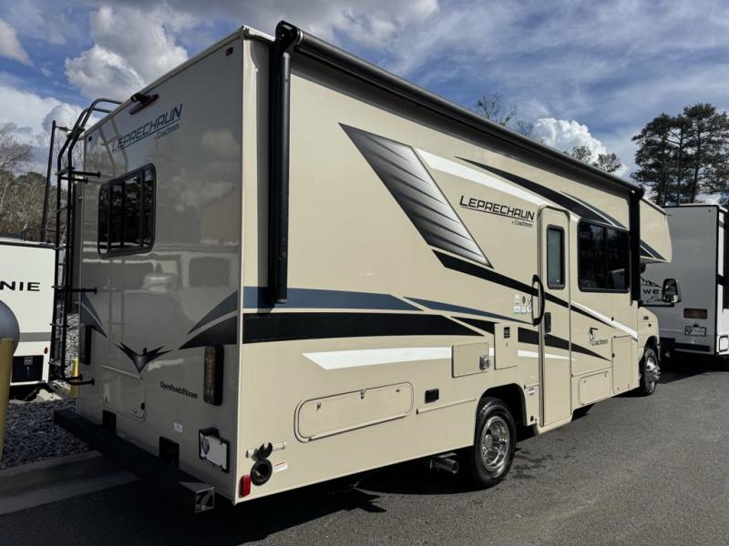 Coachmen Leprechaun Premier Class C gas motorhome 260DS highlights: Premier Unit, Exterior Pull-Out Extension, 44" x 76" J-Lounge, Bunk Over Cab, 62" Sofa, Private Bedroom. The worst thing you do could is pass up this Leprechaun Premier Class C gas motorhome! This coach is filled with exceptionally helpful amenities, like the flip-down extension in the kitchen, the J-lounge with 18" extension, the full bathroom with skylight and upgraded glass shower door, and the two pantries. You have lots of great options with this coach because there is an optional outdoor kitchen table you can add as well as an optional 2nd A/C, recliners, and side-by-side refrigerator. The two slides create extra space on the interior for you to relax, and the swing-arm TV will be fun to watch. For premier features and an all-around premier coach, choose the Coachmen Leprechaun Premier Class C gas motorhome! You will appreciate having high-class interiors styled with modern décor. There are premium hardwood cabinets, premium vinyl flooring, and USB charging ports. The construction is created with a CrossFlex PVC polyester reinforced roof material, full aluminum-framed walls, roof, and floor structures, and high-gloss, color-infused HD fiberglass walls with graphics package. You'll also have a power awning with LED lights to use while outside gathering with friends, and the Roto-cast rear warehouse storage compartment can keep your belongings secure.