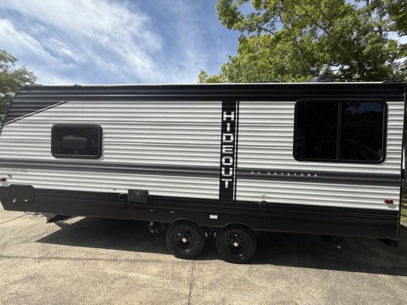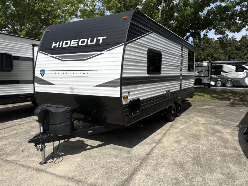 Keystone Hideout travel trailer 202RD highlights: Queen-Size Bed, Jackknife Sofa, Full Bathroom, Pantry. This Hideout travel trailer has a rear booth dinette that you can use for dining or sleeping. You also have a jackknife sofa to help with the sleeping capacity, and the 10-cubic foot refrigerator is right next to the sofa for easy access while you're lounging. A central vacuum helps you keep the interior clean and free of dirt, and the 38" tub/shower in the full bathroom helps you keep yourself clean too. Prepare any of your favorite meals on the three-burner range, and keep your dirty clothes hidden from sight by using the laundry chute next to the queen-size bed. The Keystone Hideout travel trailer, fifth wheel, and destination trailer will be just what the doctor ordered for a stress-free holiday at your favorite campsite! There are a few exclusive features that you'll only find on a Keystone product, like the color-coded unified wiring, the preparations for 4G LTE and Wi-Fi, the Tuf-Lok thermoplastic duct joiners, the in-floor heating ducts, and the Tru-fit slide construction. Each model has a power awning for some shade in the afternoon, and the tinted safety glass windows will prevent the harmful UV rays from getting inside. You'll also have blackout night shades that you can close when you want privacy, and the SolarFlex 200 is a solar power system that will refill your battery to operate onboard 12V systems with just one day of peak sun exposure.