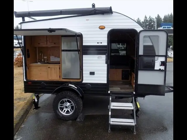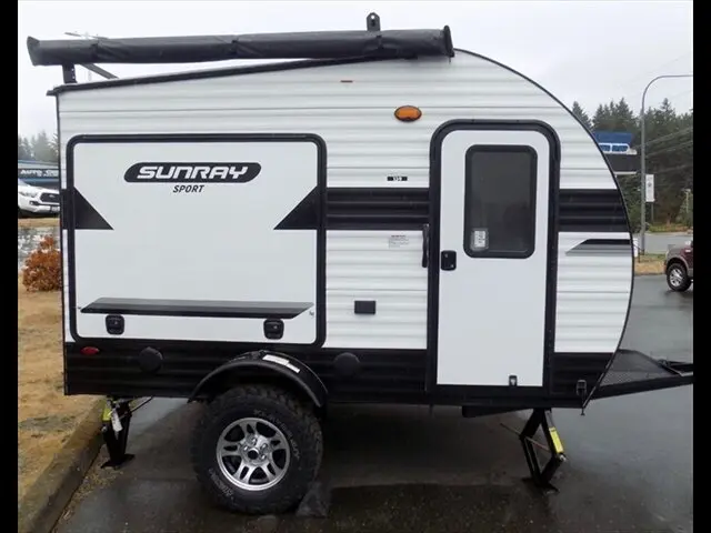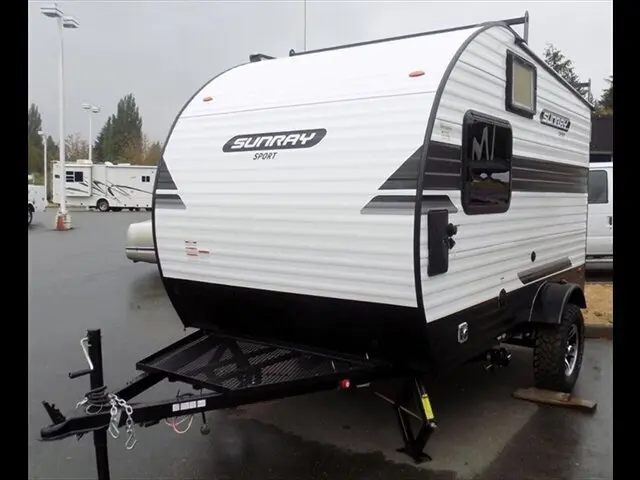 This new 2022 Sunset Park Sunray 139 travel trailer is available at Hudson Auto and RV Center. It features a white exterior and Notty Pine interior. With 0 miles, it's in perfect condition.
