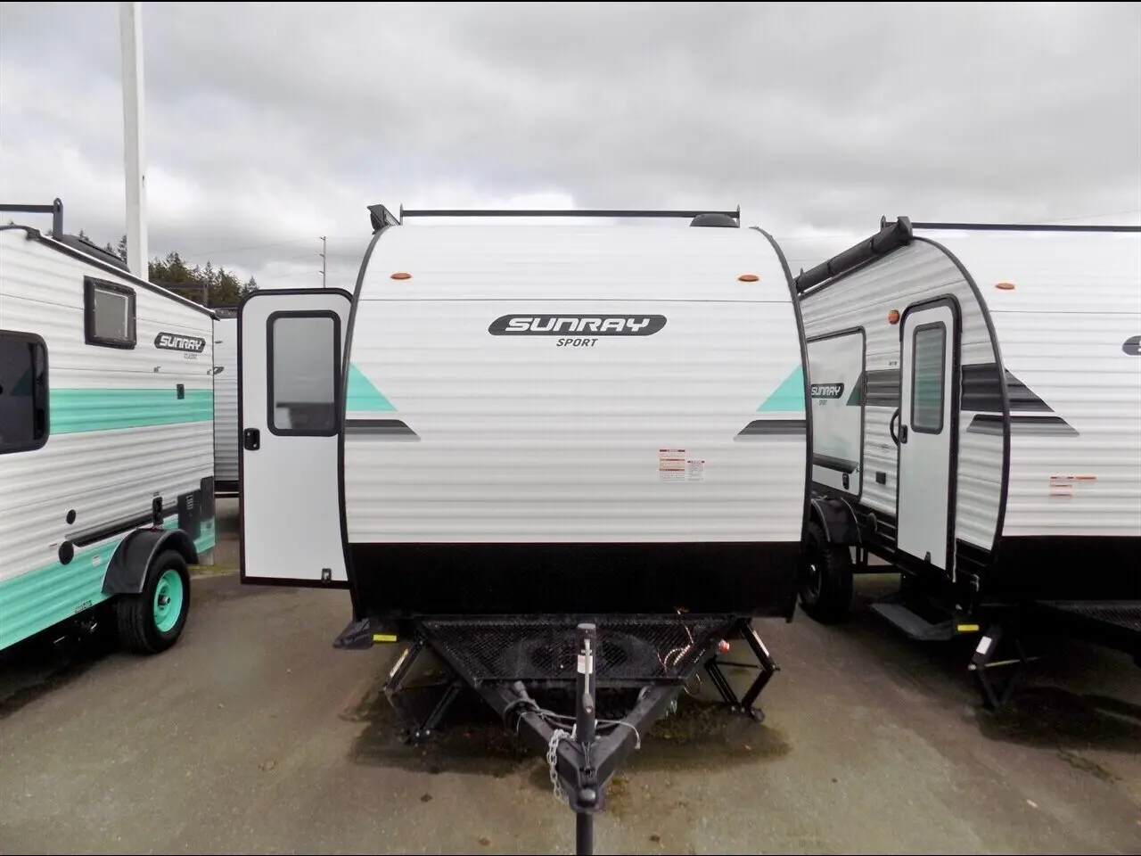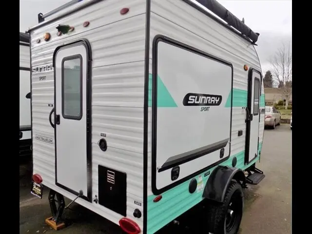 This new 2022 Sunset Park Sunray 139 is a travel trailer with a white and turquoise exterior. It features a towable design and sleeps up to two people. The interior is ash-colored. This RV is in excellent condition with zero miles.