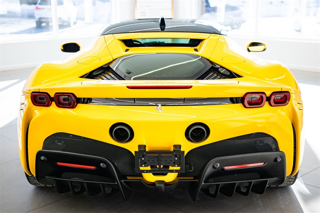 This 2023 Ferrari SF90 Stradale is powered by new plug-in hybrid technology with a 3.9-liter twin-turbo V8 engine and three electric motors, creating a combined 986hp delivered to all four wheels through an 8-speed F1 dual-clutch automatic transmission. The SF90 is the first mid-engine Ferrari with all-wheel drive. Per Car and Driver magazine testing, the SF90 Stradale achieved a 2.0-second 0-to-60 time (the fastest car they've ever tested) with an estimated top speed of 211 mph. This example is finished in brilliant Giallo Modena over a Nero interior. This SF90 comes highly equipped with over $66,000 in Ferrari options, including the suspension lifter, back radar, Adaptive Frontlight System, red brake calipers, interior and exterior carbon fiber, Daytona style seats, black ceramic exhaust tips and much more. The MSRP of this SF90 is $591,114. The sale includes a copy of the Window Sticker. This one-owner Ferrari has been fully serviced by a Ferrari dealership. 1,265 actual miles.