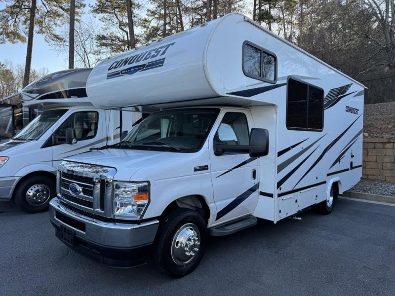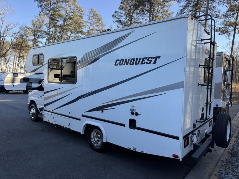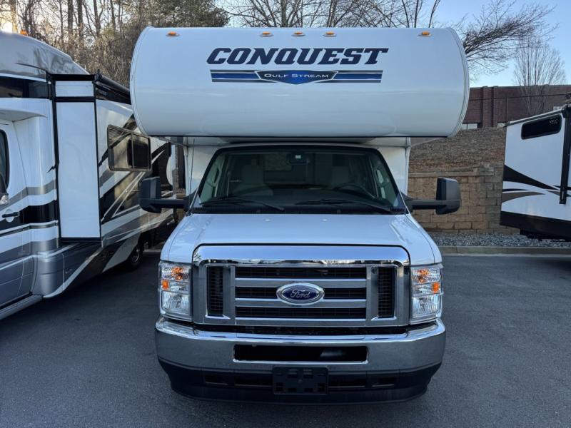 Gulf Stream Conquest Class C gas motorhome 6237LE highlights: Booth Dinette, Wardrobe, Full Bathroom, Basement Storage, Bunk Over Cab. Looking for sleeping space for five, extra storage space, and loads of comfort in your next motorhome? This Conquest Class C gas motorhome gives you a double-door basement storage allowing you to bring extra gear and an interior wardrobe and overhead cabinets so that you can travel for a weekend getaway or a month-long vacation. You will have your own bed while your guests or kids sleep on the overhead bunk and booth dinette, and you will also be able to make meals in the galley kitchen and get cleaned up in your own full bathroom. Each one of these Gulf Stream RV Conquest Class C gas motorhomes is built with a Cradle of Strength® on either the Ford E350 or E450 chassis depending on the model! Their construction also consists of a welded aluminum perimeter frame, a seamless EPDM rubber roof, and a high-gloss fiberglass exterior with Azdel synthetic substrate in the walls to prevent rotting. The included Conquest Luxury package comes with high-performance vinyl flooring throughout for an easier clean, all stainless steel appliances, and an AM/FM/CD stereo with built-in monitor and back-up camera. It also adds exterior conveniences like upgraded exterior lighting, upgraded exterior graphics, a friction-hinge entry door, and an electric awning with LED lights to relax under whether day or night!