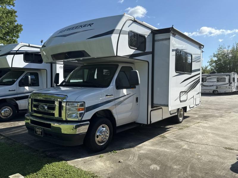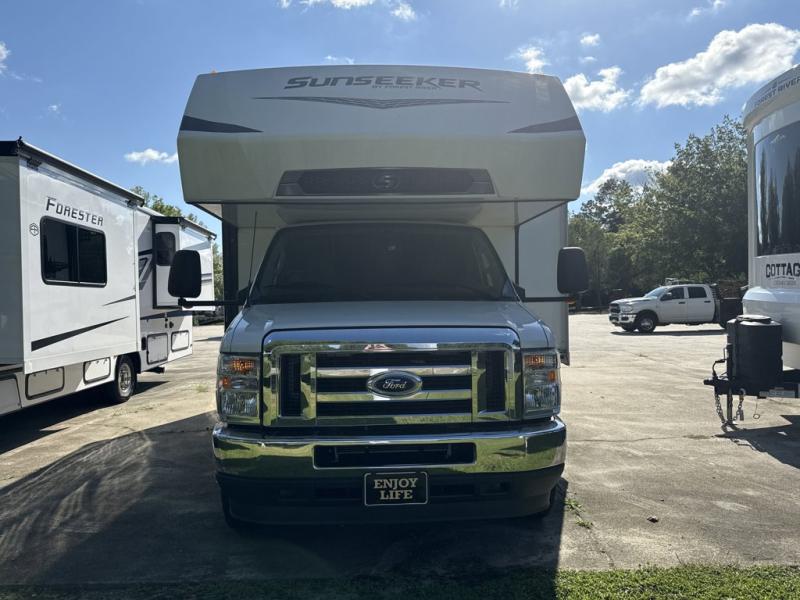 Forest River Sunseeker LE Class C gas motorhome 2150SLE Ford highlights: Bunk Over Cab, Rear Corner Bathroom, Front Storage, U-Shaped Dinette, 12V LED TV. Take your family on great adventures in this Sunseeker LE Class C gas motorhome! This coach has a full kitchen equipped with a flip-up countertop, 1.3-cubic foot convection microwave, recessed three-burner range, soft-touch self-closing drawer guides, and a 10.7-cubic foot 12V refrigerator. Across from the kitchen is a U-shaped dinette that also has four seatbelts for traveling, and there are two large storage drawers in the dinette. The bathroom has an electric roof fan, an oxygen-infused shower head with flexible extension, and a shower skylight for more natural light in the morning. There is also a 12V LED TV for entertainment at night out in the main living area. Each Forest River Sunseeker LE Class C gas motorhome comes with the LE Premier Package for your benefit!