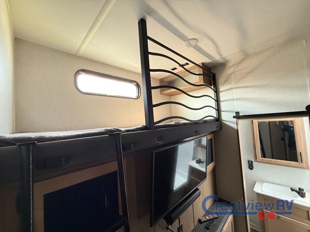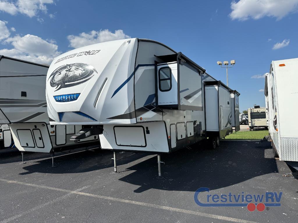 Forest River Cherokee Arctic Wolf Suite fifth wheel 3810 highlights: Private Bunkhouse Suite, Kitchen Island, Walk-In Pantry, Exterior Pull-Out Griddle, King Bed Slide Out. You can't beat this dual entry fifth wheel packed with luxury amenities! Your guests will love the rear private bunkhouse with their own full bath and exterior entry door, plus a jackknife sofa with drawers and a flip-up bunk. There is even a loft with a bunk mat for more sleeping space! The main kitchen and living area includes dual opposing slides, theater seating across from the fireplace, and even a coffee bar where you can set up your Keurig machine. There is also a table with two fixed chairs and two folding chairs, a second pantry, plus a 12V refrigerator for food storage. You'll find the second full bath to be super convenient when traveling with friends and family, and the front private bedroom will feel just like home. Here, you'll find a king bed slide out, an oversized front bedroom closet with built in shelves and sliding doors, plus a desk with a makeup area that can double as a work desk if needed. Head outdoors to enjoy the exterior griddle and two exterior refrigerators, plus the 15' power awning and pass-through storage! You will have amazing residential comfort in the Forest River Cherokee Arctic Wolf Suite fifth wheels! These units have a “SuperStor” dual-cavern basement storage compartment to allow you to bring more gear, and they have been constructed with a “ToughBend” rigid skirt metal design, a 1x engineered wood “SuperTruss” roof structure with 3/8" decking, and a 5/8” tongue-and-groove plywood floor decking. Each model includes Leash Latch pet safety technology, an outside shower with hot/cold water, preparations for an exterior TV, motion-sensing lighting, and a smart monitor panel with smart phone Bluetooth connectivity. The supersized central air conditioning unit (15,000 BTU) with quick cool air dump feature and second oversized 15,000 BTU ducted air conditioner will cool your unit down in a snap when you camp in the hot summer months.