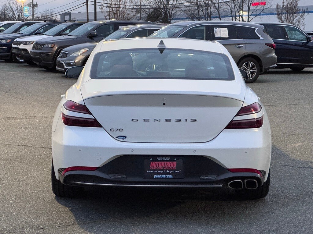 Certified. Verbier White 2023 Genesis G70 2.0T RWD 8-Speed Automatic with SHIFTRONIC I4 one owner. Recent Arrival! Odometer is 10098 miles below market average! 21/31 City/Highway MPG. Please note, while Greensboro Auto Center makes every effort to ensure our vehicles are listed accurately, we are not responsible for errors or omissions. Please verify that all vehicle options, colors, vehicle condition, mileage, pricing and availability prior to your purchase.