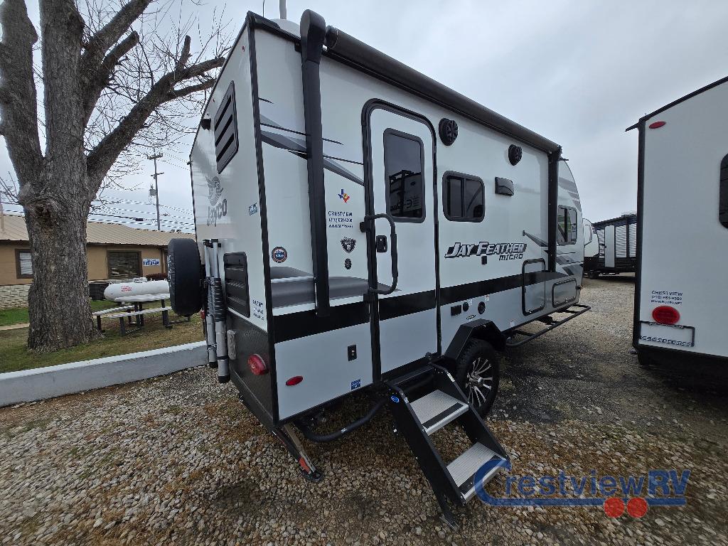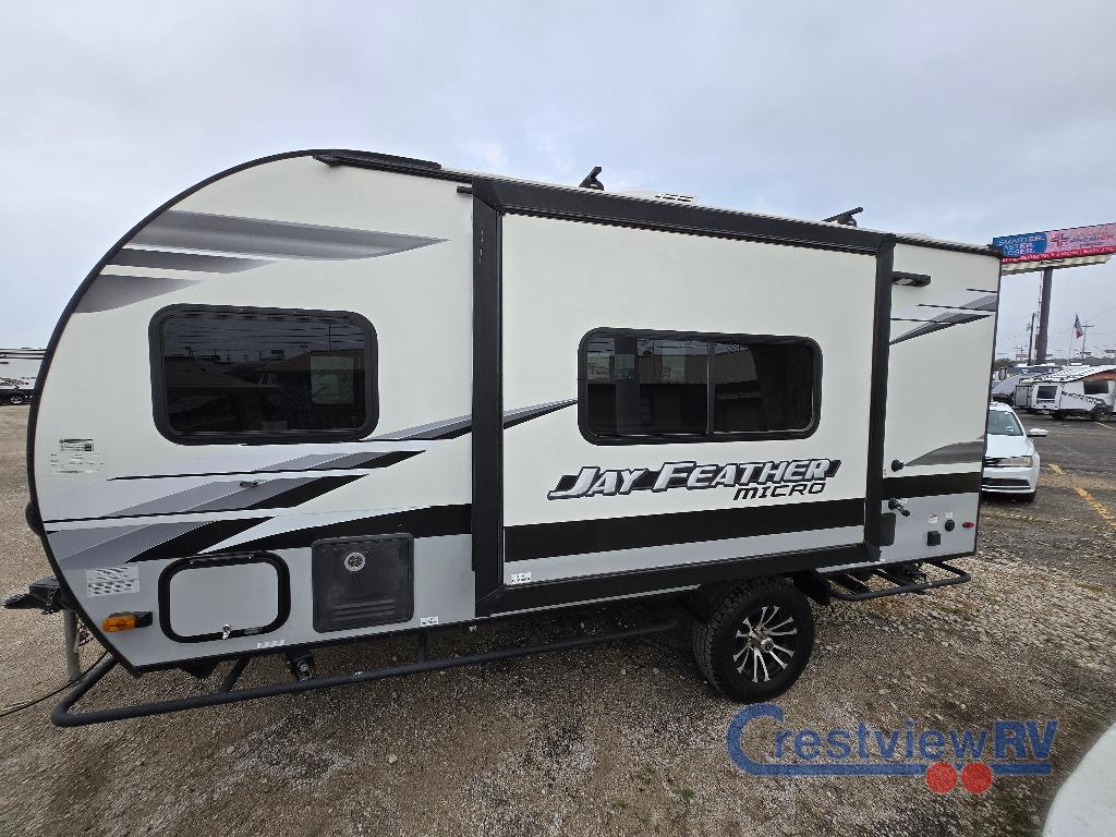 Jayco Jay Feather Micro travel trailer 166FBS highlights: Full Bath 11' Power Awning with LED Lights On-Demand Tankless Water Heater Single Slide Out Microwave Weekends at the lake are made comfortable in this single slide out travel trailer. You will enjoy your own 54" x 80" front bed so you don't have to sleep on the floor, plus there is a jack-knife sofa if you have an overnight guest. The full bath features a radius shower with a skylight, plus plenty of storage space for your medicines and toiletries. This model includes a microwave oven and a three burner cooktop to prepare meals each day, and an 8 cu. ft. 12V refrigerator for perishables. You will also find an exterior refrigerator for cold drinks, plus a Jayport system with an LP quick connect. The Jay Feather Micro travel trailers by Jayco are for those looking for lightweight camping, while not sacrificing comfort and convenience. The modern retro graphics package is sure to be eye-catching, and the newly designed interiors will have you feeling right at home. Each model features an American-made frame with an integrated A-frame, Goodyear off-road tires, plus a new Rock Solid stabilizer system for a more stable camping experience. Some of the interior comforts you will enjoy are the residential vinyl flooring with cold crack resistance, screwed and glued cabinetry, and LED lighting. Adventure is waiting for you with a Jay Feather Micro travel trailer. Choose your favorite floorplan today!