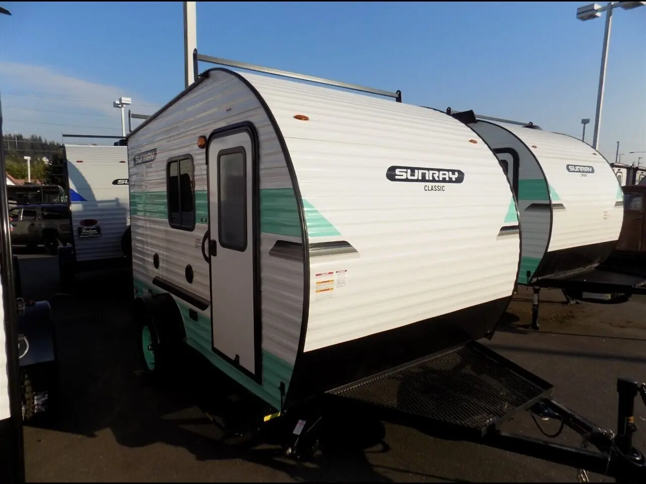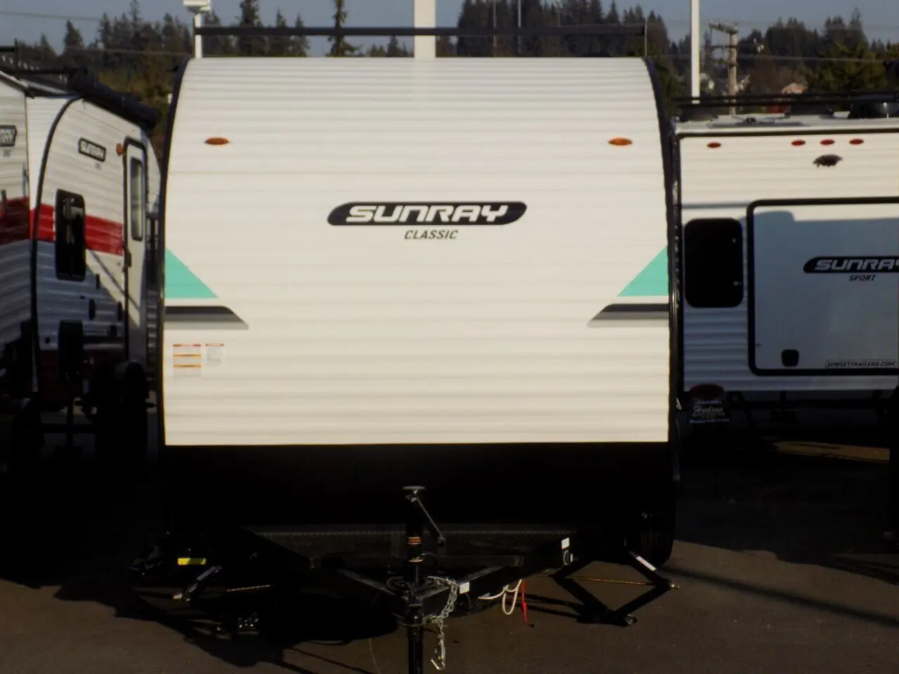 This 2023 Sunset Park Sunray 129 is a new travel trailer with 0 miles. It features a white and turquoise exterior and an ash interior. The trailer is towable and has a sleeping capacity of 2. The dealer price is $18,827.