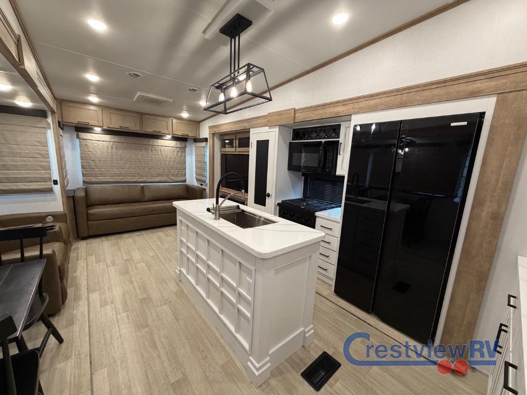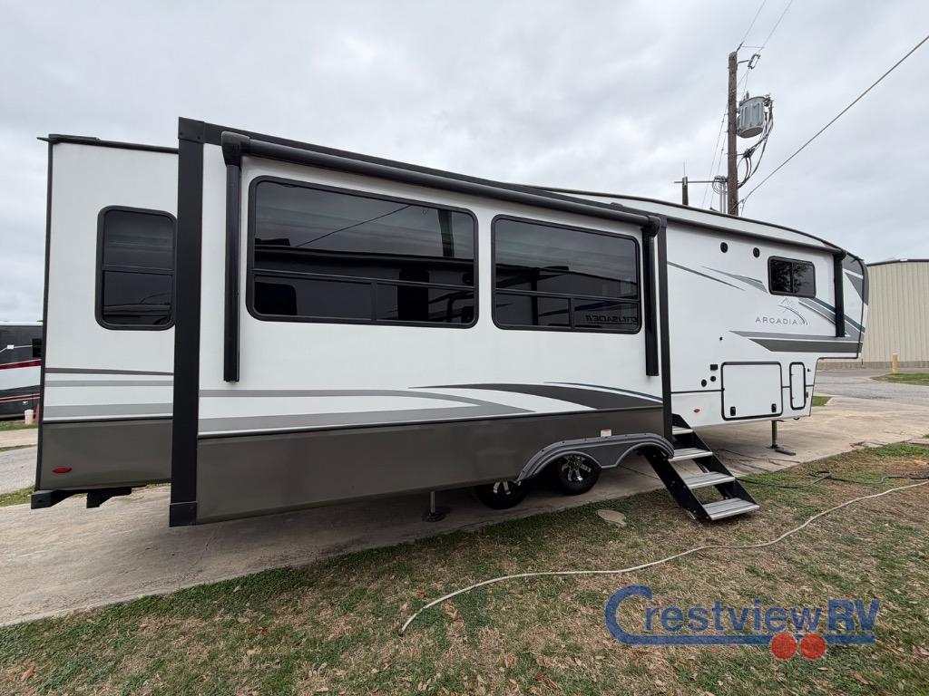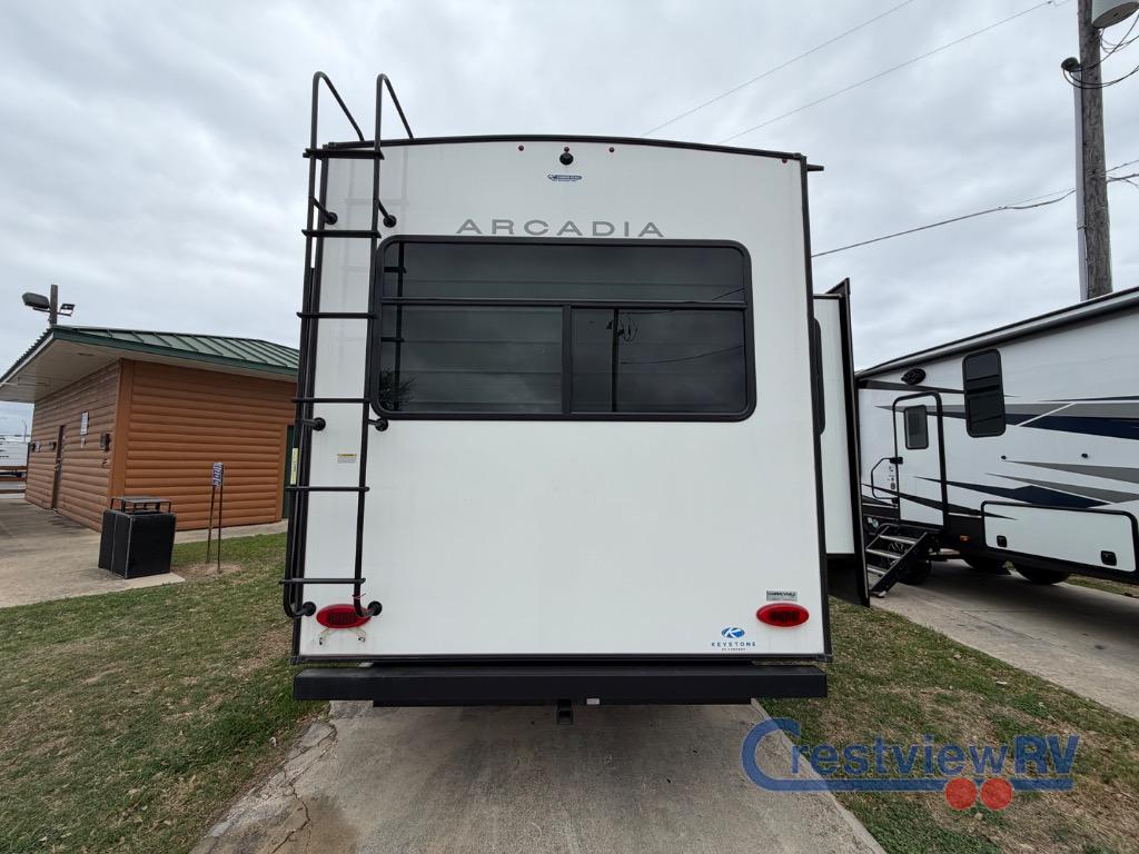 Keystone RV Arcadia fifth wheel 3260RL highlights: Kitchen Island, Front Private Bedroom, Rear Living Area, Two Awnings, Pass-Through Storage. You will feel right at home in this fifth wheel! The chef will love the kitchen island with a butcher block sink cover for extra meal prepping space, and the 16 cu. ft. "Solar Friendly" refrigerator with dent resistant doors is big enough to bring all of your favorite foods to cook. There is a front private bedroom with a California king bed slide for a comfortable night's rest and across from it is shelving with TV prep and a bench seat, plus you have a front closet with wrap around shelving and is prepped to add an optional washer and dryer. Freshen up in the full bathroom with the 48" x 30" shower then head to the rear living area to relax on either the XL sofa sleeper or theater seating while you enjoy your morning coffee in front of the fireplace and watch the morning news on the TV.