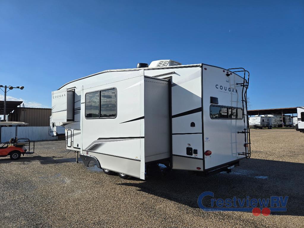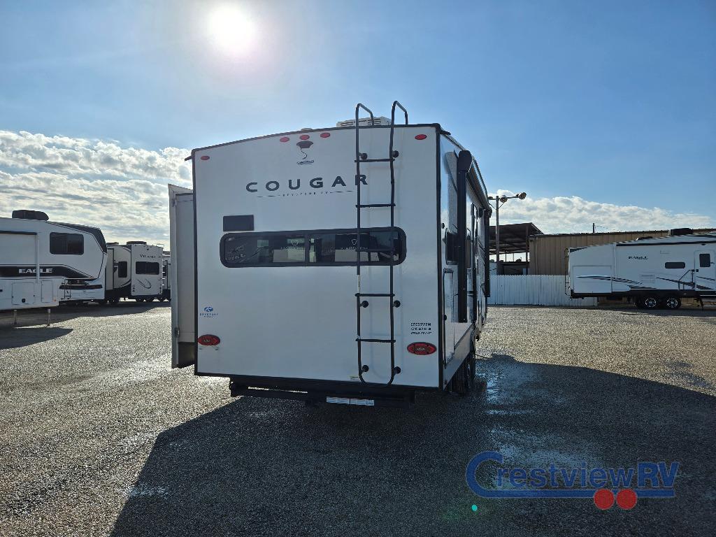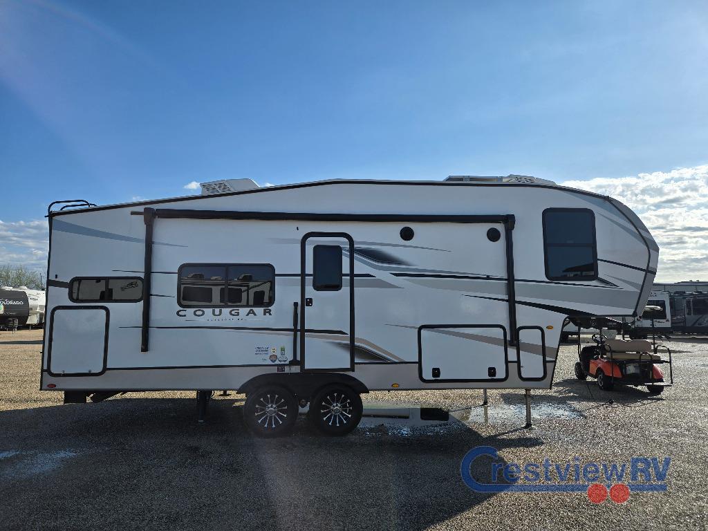 Keystone Cougar Half-Ton fifth wheel 23MLE highlights: Private Front Bedroom. If you are looking for a fifth wheel that sleeps four to six with inside and outside cooking then check this unit out! This unit offers a short, mid-living layout with a bedroom wardrobe slide and combined 12 volt refrigerator and 68" tri-fold sofa sleeper slide for added floorspace to move about. Up front, you will enjoy a private bedroom with a queen bed and bedside wardrobe/nightstands as well as a larger wardrobe that slides out along the curbside wall. A complete bath provides a large shower, toilet and sink, plus linen storage which you are sure to appreciate as you travel. There are plenty of options for this unit making it easy to customize to your use and style. The Keystone Cougar Half-Ton is one of America's favorites for a reason! The Cougar Half-Ton is one of the America's favorites for America.
