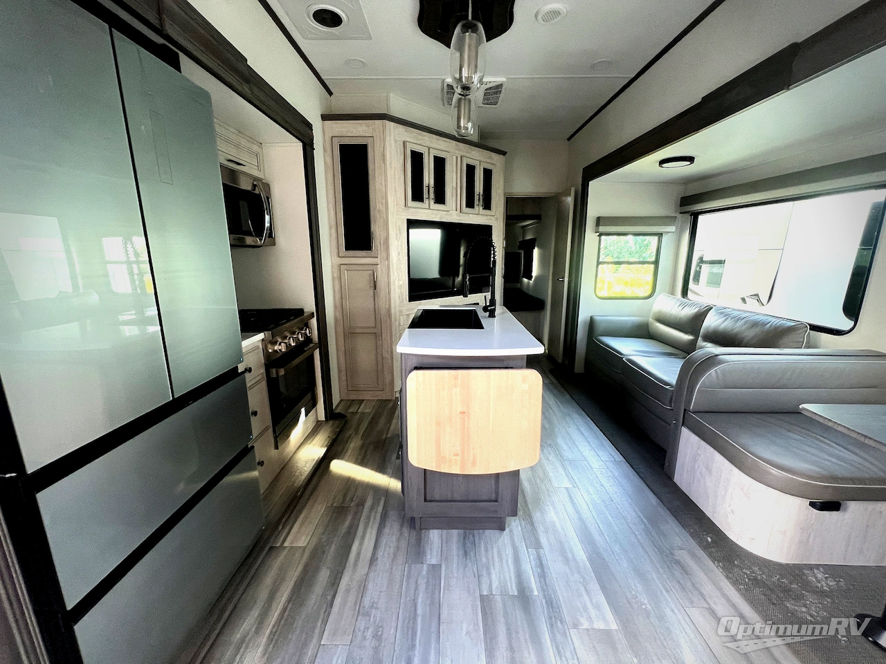 Forest River Sierra fifth wheel 3550BH highlights: Kitchen Island, Shower with a Seat, Triple Slides, Dual Entry Doors, Pass-Through Storage, Front Private Bedroom. This fifth wheel is perfect for those who like to camp with a whole group, whether it be with family or friends! There is a rear private suite with a lower RV queen bed and loft bed, a half bath, and your own private entrance. The front private bedroom includes a king bed slide out with a large front wardrobe, a dresser, and washer/dryer prep. And the spacious full bath is close by for easy nighttime use. Everyone can meet in the main living area that includes dual opposing slides, a tri-fold sofa and a booth dinette, plus a 50" TV for movie night. There is also a coffee bar here where you can set up your Keurig machine, a pantry for snacks, and a ceiling fan to keep the air moving. You will also love the exterior cooktop for breakfast outdoors, and the two power awnings with LED lights will provide shade during the day and ambience at night! Each one of these Forest River Sierra fifth wheels are equipped with everything you need to make the most of each adventure! The underbelly armor will protect your unit's vitals from road debris and the painted two tone aerodynamic fiberglass front cap has an improved turning radius to make them easier to navigate. With an electric leveling system, you can set your unit up quick and easy then get to having fun faster than ever.