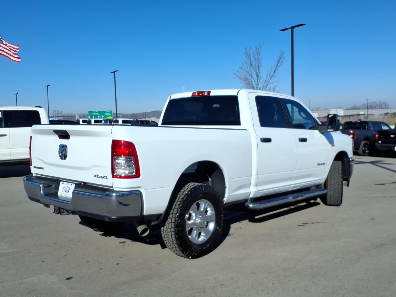 We'll trade for anything that don't eat! One owner! No accidents!! Bright White Clearcoat 2024 Ram 2500 Big Horn 4WD 6-Speed Automatic Cummins 6.7L I6 Turbodiesel. One owner, no accidents, 2 Way Rear Headrest Seat, 220 Amp Alternator, 2nd Row In Floor Storage Bins, 3.73 Axle Ratio, 4 Way Front Headrests, 4-Wheel Disc Brakes, 40/20/40 Split Bench Seat, 4G LTE Wi-Fi Hot Spot, 6 Speakers, 8.4" Touchscreen Display, ABS brakes, Active Noise Control System, Air Conditioning, Anti-Spin Differential Rear Axle, Apple CarPlay, Auto Power-Folding Mirrors, Big Horn IP Badge, Black Exterior Mirrors, Bluetooth Handsfree Phone & Audio, Brake assist, Bumpers: chrome, Center Hub, Center Stack Storage Drawer, Chrome Flat Cab-Length Side Steps, Cold Weather Group, Compass, Connectivity - US/Canada, Delay-off headlights, Driver door bin, Dual front side impact airbags, Dual Glove Boxes, Electronic Stability Control, Electronically Controlled Throttle, Engine Block Heater, Exterior Mirrors Courtesy Lamps, Exterior Mirrors w/Heating Element, Exterior Mirrors w/Supplemental Signals, Foam Bottle Insert (Door Trim Panel), Footwell Courtesy Lamp, For Details Visit DriveUconnect.com, For More Info Call 800-643-2112, Forward & Reverse Utility Lights, Front anti-roll bar, Front Armrest w/Cupholders, Front Center Armrest w/Storage, Front Center Seat Cushion Storage, Front Fog Lamps, Front License Plate Bracket, Front Performance Tuned Shock Absorbers, Front reading lights, Front Seat Back Map Pockets, Fully automatic headlights, Global Telematics Box Module (TBM), Glove Box Lamp, Google Android Auto, GPS Antenna Input, Heated door mirrors, Heavy Duty Snow Plow Prep Group, Hill Descent Control, Illuminated entry, Integrated Center Stack Radio, Integrated Voice Command w/Bluetooth, Leather Wrapped Steering Wheel, Level 1 Equipment Group, Locking Lower Glove Box, Low tire pressure warning, Manual Adjust 4-Way Front Passenger Seat, Mirror Running Lights, MOPAR Spray In Bedliner, MOPAR Winter Front Grille Cover, Occupant sensing airbag, Off Road Package, Outside temperature display, Overhead airbag, Overhead console.