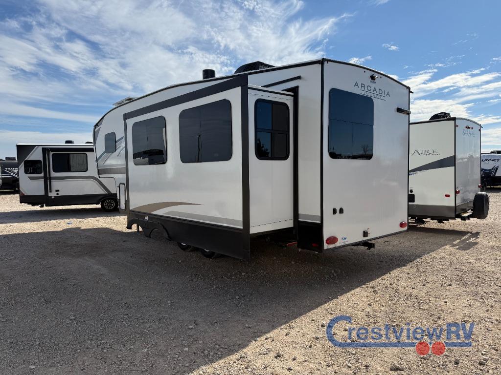 Keystone Arcadia Select fifth wheel 24SRE highlights: Large Slide Out, Middle Living Area, Queen Bed, Tri-Fold Sofa, Flip-Up Desk, Trips to the lake are made complete in this spacious fifth wheel that can sleep five each night. You'll enjoy your own private bedroom up front that includes a queen bed, a wardrobe, plus bedside wardrobes and nightstands for your things. After you've made dinner on the cooktop, you can dine at the booth dinette. There is additional seating on the tri-fold sofa, and both of these areas can double as sleeping space for guests. If you're wanting a little more comfort, just choose the optional theater seating in place of the sofa. A flip-up desk in the back will let you get some work done if needed, and the hidden walk-in pantry behind the TV/fireplace is a huge convenience! With any Arcadia Select fifth wheel by Keystone you will enjoy easy towability and at-home comforts at an affordable price! The laminated sidewalls with five sided aluminum superstructure will provide a strong foundation so you can enjoy your RV for years to come, plus a one-piece, heated and enclosed polypropylene underbelly means you can camp year around! And an upgraded Roto-Flex hitch pin with will make it easy to tow. Head inside to find tall slides for added space, seamless, pressed countertops, convenient underbed storage, and a large shower with a retractable door and skylight. These fifth wheels also include a Blade Pure A/C system, Girard on-demand tankless water heater, two 30 lb. LP tanks, and more utilities to make your camping experience run smoothly.