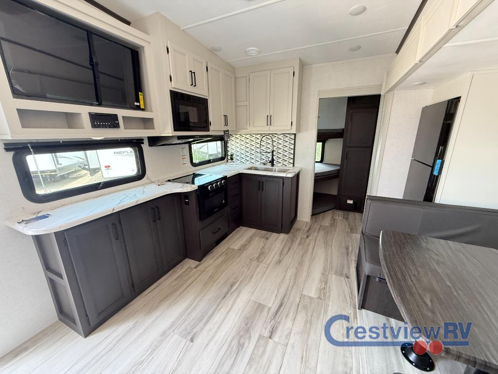 Keystone Arcadia Select fifth wheel 27SBH highlights: 20' Electric Awning, U-Shaped Dinette Slide, Queen Bed, Triple Double-Size Bunks. This fifth wheel with an open concept kitchen and living area is sure to feel just like home! You can relax with friends and family around the U-shaped dinette or on the tri-fold sleeper sofa, and there is a TV/radio in this space for entertainment. The rear private bunkhouse includes double-size triple bunks and a wardrobe for your guests' things, and you'll have your own wardrobes up front in the private bedroom. There is also a queen bed here and dual nightstands to keep your phone and glasses close by. And don't overlook the exterior with its 20' electric awning and LCI Solid Steps! With any Arcadia Select fifth wheel by Keystone you will enjoy easy towability and at-home comforts at an affordable price! The laminated sidewalls with five sided aluminum superstructure will provide a strong foundation so you can enjoy your RV for years to come, plus a one-piece, heated and enclosed polypropylene underbelly means you can camp year around! And an upgraded Roto-Flex hitch pin will make it easy to tow. Head inside to find tall slides for added space, seamless, pressed countertops, convenient underbed storage, and a large shower with a retractable door and skylight. These fifth wheels also include a Blade Pure A/C system, Girard on-demand tankless water heater, two 30 lb. LP tanks, and more utilities to make your camping experience run smoothly.
