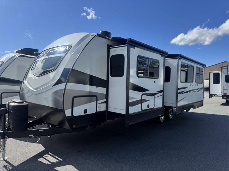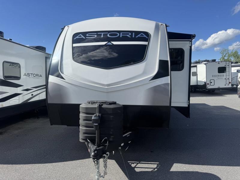 Dutchmen Astoria travel trailer 2623RK highlights: Dual Entry Doors, Rear Kitchen, Theater Seats, Full Bath. Step right in to this spacious rear kitchen travel trailer for unforgettable camping trips! The rear kitchen includes a three burner cooktop with oven and glass cover, a microwave oven, and a 10 cu. ft. 12V refrigerator for perishables. Within the large slide out, you can dine at the booth dinette and relax on the theater seats after dinner. There is also an HD LED TV across from the sofa for easy viewing. The second slide out is found in the front bedroom, along with a king bed, storage space, and a front seating space. You'll also find plenty of storage throughout, including exterior storage and an entry closet to keep jackets, food, and more! Each one of these Dutchmen RV Astoria and travel trailers offer highly visible, value-driven standard features and a sturdy construction with Vacuum Bonded walls! You can store your outdoor gear in the pass-through storage areas and the slam latch baggage doors. Their modern interior décor includes carpet free slides, blackout roller shades, and designer valances. HyperDeck flooring will also be easy to clean, as well as hold up through each and every adventure. Don't waste anymore time, come find your perfect model today!