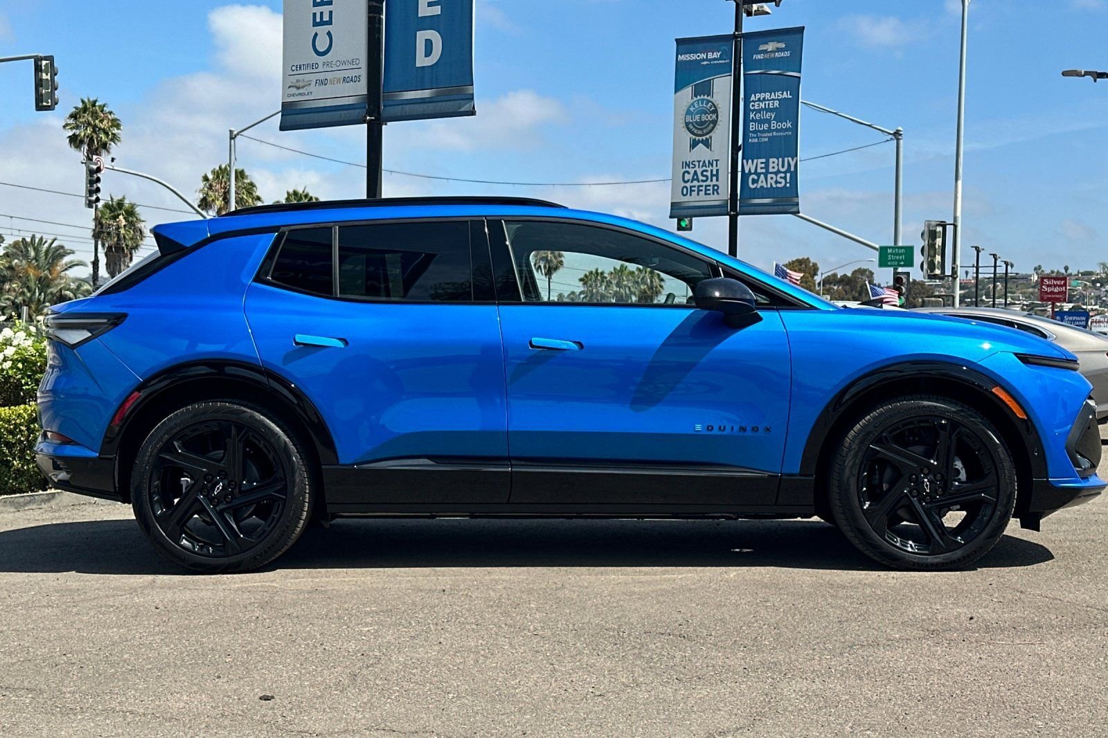 Equinox EV RS, 4D Sport Utility, Electric Motor, 1-Speed Automatic, AWD, Riptide Blue Metallic, Black With Red Accents Premium Synthetic, 2-Way Front Passenger Power Lumbar, 6-Speaker Audio System Feature, Active Safety Package 3, Air Conditioning, Alloy wheels, AM/FM radio: SiriusXM with 360L, Auto High-beam Headlights, Automatic temperature control, Brake assist, Convenience Package II, Delay-off headlights, Driver door bin, Driver Memory, Driver vanity mirror, Dual-Zone Automatic Climate Control, Electronic Stability Control, Enhanced Automatic Parking Assist, Four wheel independent suspension, Front anti-roll bar, Front Center Armrest, Front Passenger 6-Way Power Seat Adjuster, Fully automatic headlights, Head-Up Display, Heated front seats, Heated Rear Outboard Passenger Cushion, Heated Wiper Park, Knee airbag, LED Headlamps, Low tire pressure warning, Navigation system: Google built-in compatibility (select service plan required, terms and limitations apply), Occupant sensing airbag, Outside temperature display, Overhead airbag, Overhead console, Panic alarm, Passenger door bin, Passenger vanity mirror, Power Driver Lumbar Control, Power steering, Preferred Equipment Group 2RS, Radio: 17.7 Diagonal Advanced Color LCD Display, Rear Camera Mirror, Rear Camera Mirror Washer, Rear seat center armrest, Remote keyless entry, Security system, Speed control, Sport steering wheel, Super Cruise, Traction control, Universal Home Remote, Uplevel Neutral Density LED Tail Lamps. 2025 Riptide Blue Metallic Chevrolet Equinox EV RS AWD 1-Speed Automatic Electric Motor.