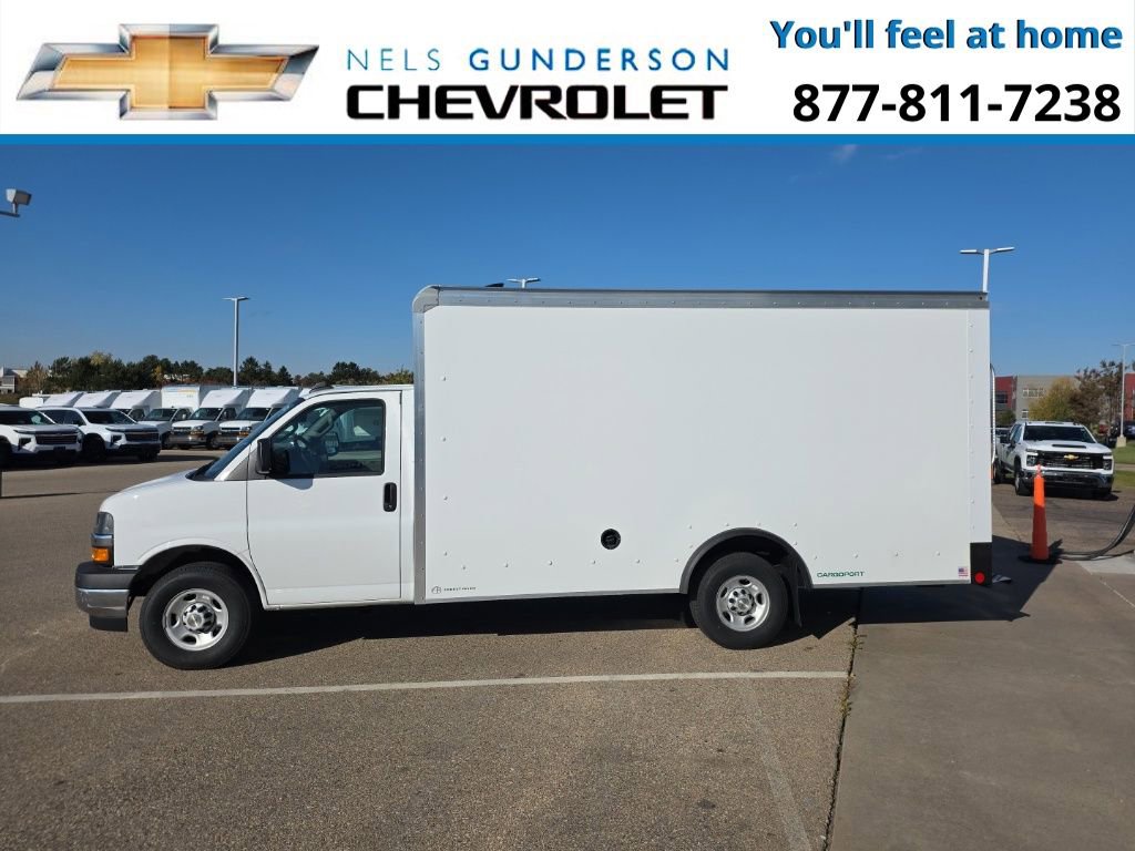 Summit White 2025 Chevrolet Express 3500 Work Van Commercial RWD 8-Speed Automatic 6.6L V8. Nels Gunderson Chevrolet is pleased to offer this gorgeous 2025 Chevrolet Express 3500 Work Van in Summit White, beautifully equipped with Chrome Appearance Package (Chrome Grille and Front Chrome Bumper w/Step-Pad), Driver Convenience Package (Tilt Steering Wheel), Power Convenience Package (Power Door Locks w/Lock-Out Protection and Power Windows), Preferred Equipment Group 1WT, and more.