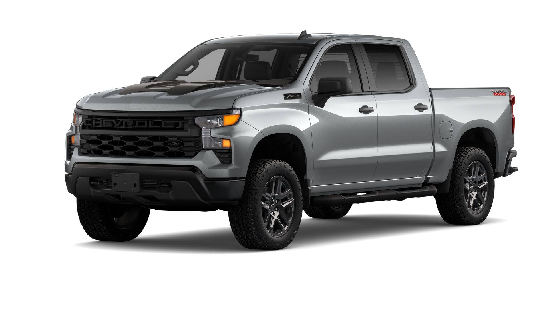The 2025 Chevrolet Silverado 1500 Custom Trail Boss is a new truck with a powerful TurboMax engine and 4WD capability. It features an 8-speed automatic transmission and a sleek Sharkskin Met-1 exterior. The interior is equipped with a Jet Black cloth seat trim and offers a spacious crew cab.