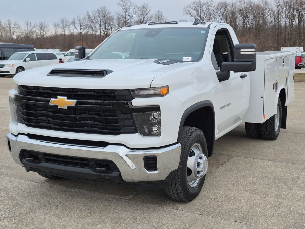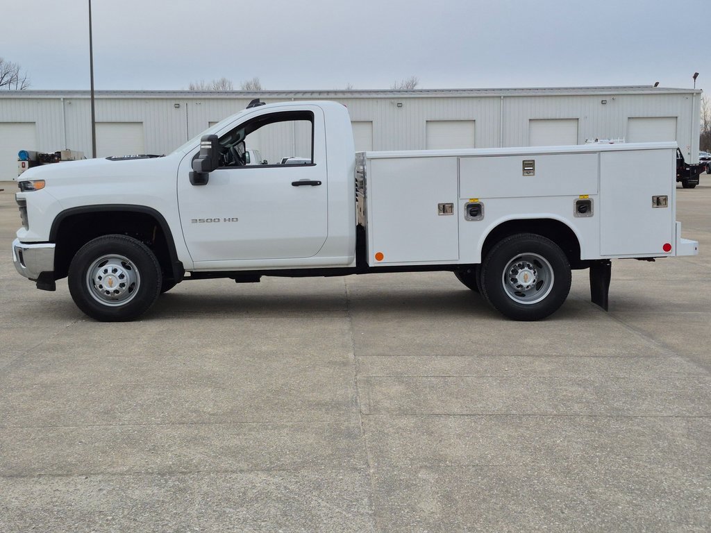 2025 Chevrolet Silverado 3500 Regular Cab DRW RWD 9' Reading Service Body. Uebelhor & Sons Chevrolet Cadillac Jasper, IN. Make / Model: 2025 Chevrolet Silverado 3500 HD. Trim: Work Truck. Body Type: Reading Service Truck Body (Utility / Service Body). Drivetrain: Rear-Wheel Drive (RWD). Cab Style: Regular Cab. Rear Axle: Dual Rear Wheels (DRW). Seating: 3-Passenger Regular Cab. Exterior Color: Summit White. Interior: Jet Black Work Truck Vinyl/Cloth. Chassis & Performance Specs: Engine: 6.6L V8 Gas Engine (L8T) strong work-ready power. Transmission: 10-Speed Automatic. Rear Axle Ratio: 3.73. GVWR: Class 3. Brake Type: Hydraulic. Wheelbase: 146.3. Cab-to-Axle: 60.