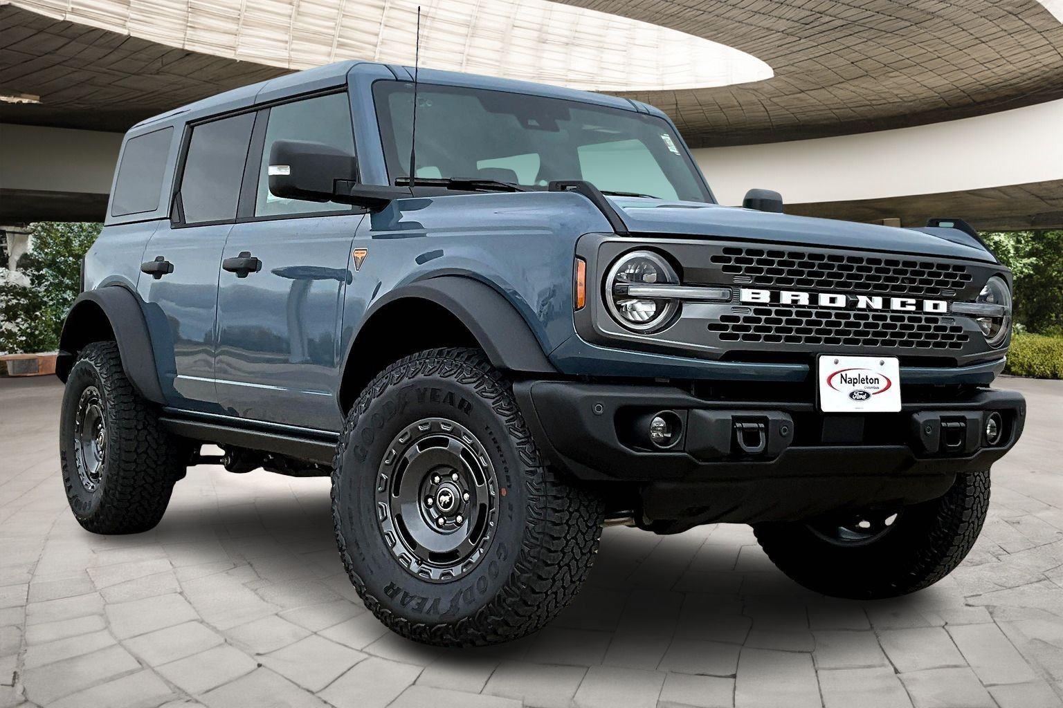 The Napleton Auto Group promotes a no pressure buying experience that puts the customer in charge of the buying process, and for over 80 years, the Napleton family has made sure that absolutely nothing is more important than our commitment to your satisfaction. Our staff members are professional in every sense of the word, and receive regular training, including factory certification, so they are truly knowledgeable about the vehicles we offer. We want every customer's experience to be as timely, comfortable and ultimately as satisfying as it possibly can be. You'll see it in every department of every Napleton Auto Group dealership. We hope you'll join the thousands of other satisfied customers that buy and service their vehicles the Napleton way. This 2025 Ford Bronco Badlands offered in Azure Gray Metallic Tri-Coat will make a great addition to your family or business!