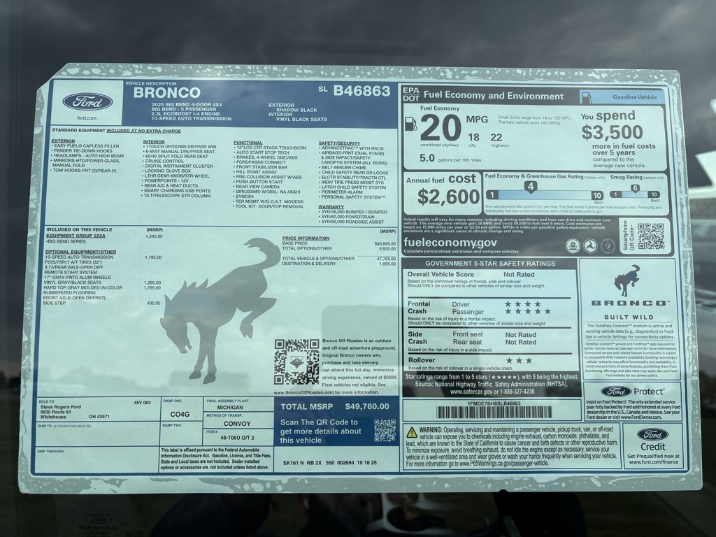 Shadow Black 2025 Ford Bronco Big Bend 4WD 2.3L EcoBoost I-4. At Steve Rogers Ford in Whitehouse, OH, we pride ourselves on offering an extensive selection of new and pre-owned Ford vehicles, including popular models like the Ford F-150, Super Duty, Escape, and Explorer. Our dealership is committed to delivering exceptional customer service and providing a seamless car buying experience. With our competitive pricing, special offers, and financing options, you can drive away in your dream Ford today. Visit us to discover why Steve Rogers Ford is the go-to destination for drivers in Ohio. Our knowledgeable sales team and top-notch service department are here to assist you with all your automotive needs. We're big enough to compete, small enough to care.