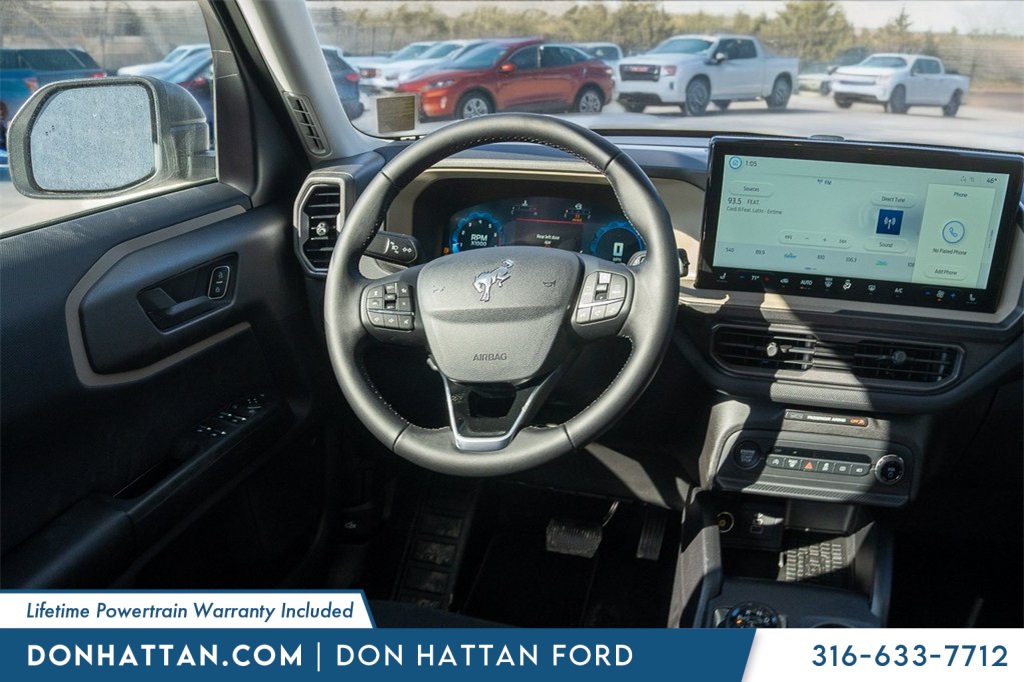 Don Hattan Ford is honored to offer this wonderful-looking 2025 Ford Bronco Sport Big Bend in Oxford White, beautifully equipped with Convenience Package (Front Driver/Passenger Seat Back Map Pockets, Heated 8-Way Power Driver's Seat, LED Fog Lamps, Premium Wrapped Steering Wheel, and Universal Garage Door Opener (UGDO)), Equipment Group 200A, Power Moonroof, 4-Wheel Disc Brakes, 6 Speakers, ABS brakes, Air Conditioning, Alloy wheels, AM/FM radio: SiriusXM, Auto High-beam Headlights, Cloth w/Easy-to-Clean Front Bucket Seats, Compass, Delay-off headlights, Driver door bin, Driver vanity mirror, Dual front impact airbags, Dual front side impact airbags, Electronic Stability Control, Emergency communication system: SYNC 4 911 Assist, Four wheel independent suspension, Fully automatic headlights, Heated door mirrors, Knee airbag, Low tire pressure warning, Occupant sensing airbag, Outside temperature display, Overhead airbag, Overhead console, Panic alarm, Passenger door bin, Passenger vanity mirror, Power door mirrors, Power steering, Power windows, Radio data system, Rear anti-roll bar, Rear Parking Sensors, Rear reading lights, Rear seat center armrest, Rear window defroster, Rear window wiper, Remote keyless entry, Security system, SiriusXM, Speed control, Speed-sensing steering, Speed-Sensitive Wipers, Split folding rear seat, Steering wheel mounted audio controls, SYNC 4 w/Enhanced Voice Recognition, Tachometer, Telescoping steering wheel, Tilt steering wheel, Traction control, Trip computer, Variably intermittent wipers, and Wheels: 17" Carbonized Gray-Painted Aluminum! Bluetooth Backup Camera. Convenience Package, Front Driver/Passenger Seat Back Map Pockets, Heated 8-Way Power Driver's Seat, LED Fog Lamps, Power Moonroof, Premium Wrapped Steering Wheel, Universal Garage Door Opener (UGDO). 2025 Big Bend 4WD 8-Speed Automatic 1.5L EcoBoost.