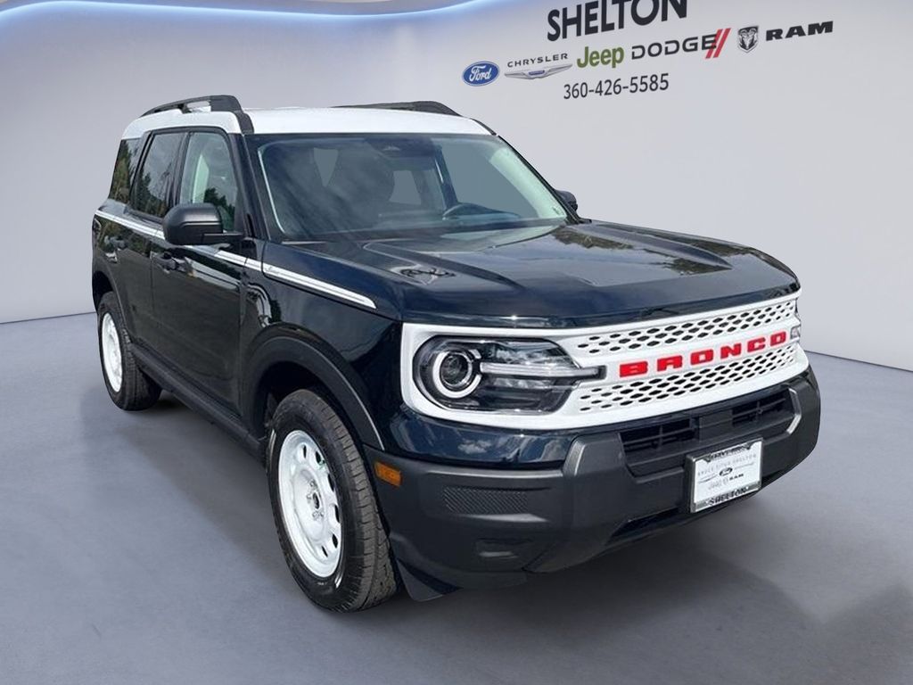 Shadow Black 2025 Ford Bronco Sport Heritage 4WD 8-Speed Automatic 1.5L EcoBoost. 25/30 City/Highway MPG. Thank you for shopping at Bruce Titus Ford & CJDR of Shelton! For car buyers who are looking for a honest and transparent experience, look no further. The Bruce Titus Automotive Group is a family-owned and operated business that puts customers first. Our goal is to provide a comfortable, hassle-free experience for our customers and to form relationships that last a lifetime. Our commitment to you does not end when you purchase your vehicle. Our transparent service and ownership experience help keep you and your vehicle safe on the road for years to come.