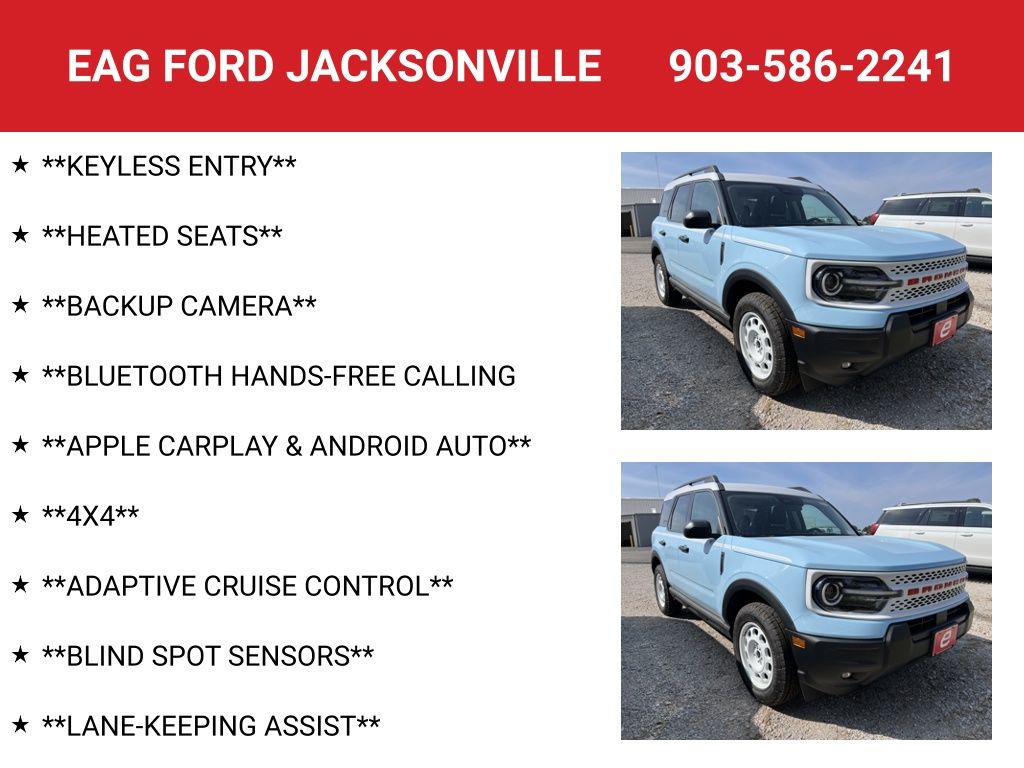 Robin's Egg Blue 2025 Ford Bronco Sport Heritage 4WD 8-Speed Automatic 1.5L EcoBoost 25/30 City/Highway MPG. The price does not include the following: $299 for window tint, $299 for VIN etching, $599 for Paint protection, $399 mudflaps (Duallys only) and $699 for bedliner (trucks only). It also excludes tax, title, license, and a documentation fee of $225. Some of the available Factory Rebates include: $2000 - Retail Customer Cash. Exp. 03/31/2026.