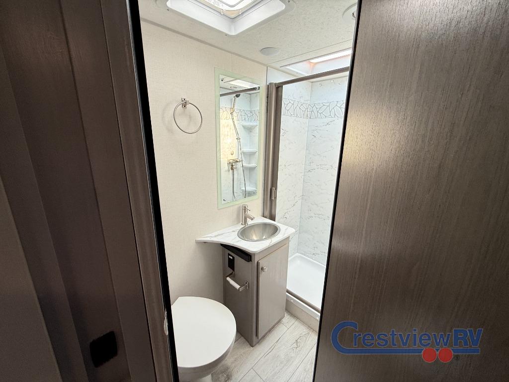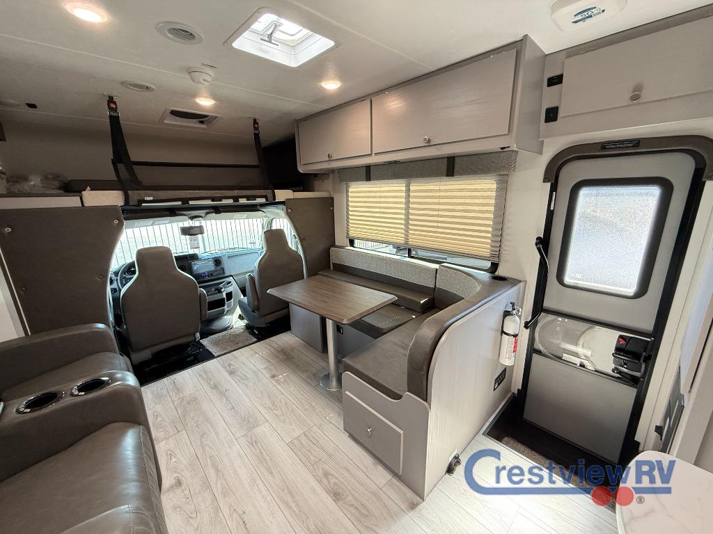 Coachmen Freelander Class C gas Motorhome 26DS Ford E-450 highlights: Dual Slides, Queen Bed, J-lounge Dinette, Two Pantries, Linen Closet. Two slide outs expand your vacation in this fun motorhome! Relax in the living area with a 62” sofa, or swap it out for optional recliners. The J-lounge dinette with an 18” extension provides another space for leisure time or gourmet meals. The kitchen layout feels spacious with two pantries and thermofoil countertops with a flip-down extension for extra prep space. In the rear, you’ll find a queen bed with overhead cabinet and dual nightstands, plus a roomy bath with shower and linen closet. Outside is an awning and you can even add on an optional outdoor kitchen table for more fun in the sun! This model also includes the CRV Supersprings Ride with heavy duty stabilizer bars, chassis electronic stability control, SumoSprings front shock absorbers, and more! The Freelander Class C gas motorhome by Coachmen is a wonderful choice for anyone looking to get out on the road. A wide variety of floorplans and features offers something for everyone. The Azdel composite sidewalls and seamless one-piece roof membrane provide a solid structure to enjoy all your trips. Conveniences like storage above entrance door with an HDMI and charge station and reclining cockpit seats are standard, along with a rear color backup camera, a premium showerhead and faucet, and one-piece thermofoil countertops. The mandatory Explorer Package includes an exterior shower to rinse off before entering inside and an on-demand tankless water heater for hot water fast. Come find your favorite one today!