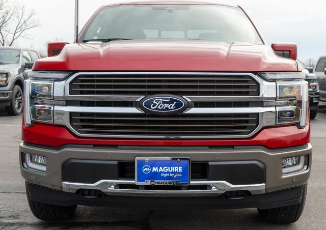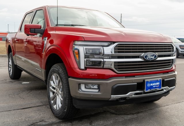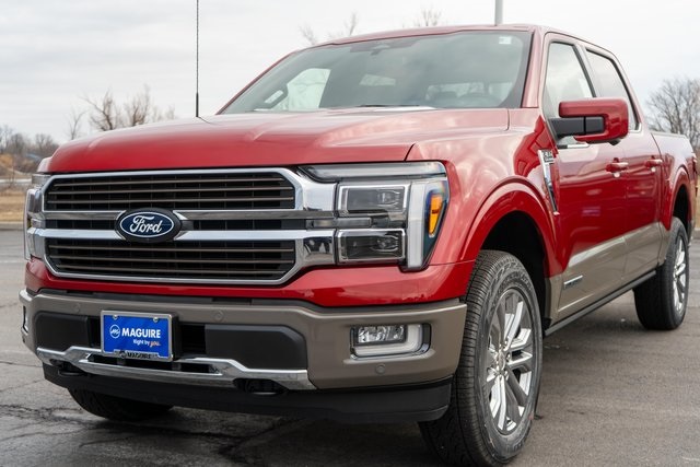 The 2025 Ford F-150 King Ranch SuperCrew Cab in Rapid Red Metallic Tinted Clearcoat features a 3.5L PowerBoost Full-Hybrid V6 engine and a range of luxury and technology features. This vehicle is designed for both comfort and capability, offering advanced safety systems, a premium sound system, and a spacious interior with King Ranch multicontour leather seats. The F-150 is equipped with the latest in driver assistance and connectivity, including adaptive cruise control, navigation, and a panoramic sunroof. This model is available on the Maguire Ford lot and can be customized to fit your needs.