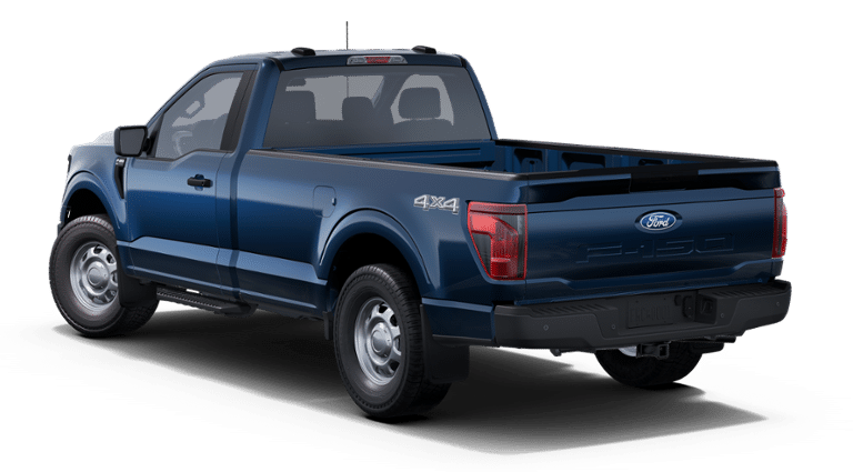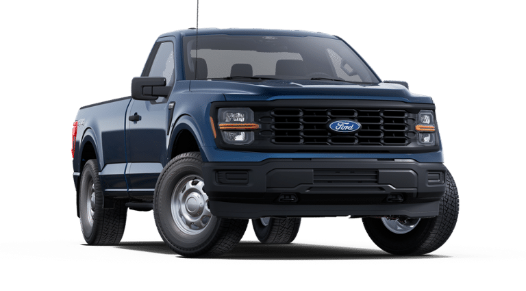 This new 2025 Ford F-150 XL features a V6 EcoBoost engine with auto start-stop technology. It includes safety features like blind spot sensor and emergency communication system. The exterior is Antimatter Blue Metallic, and the interior is Medium Dark Slate.