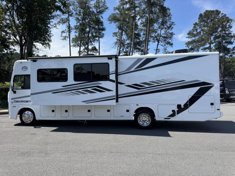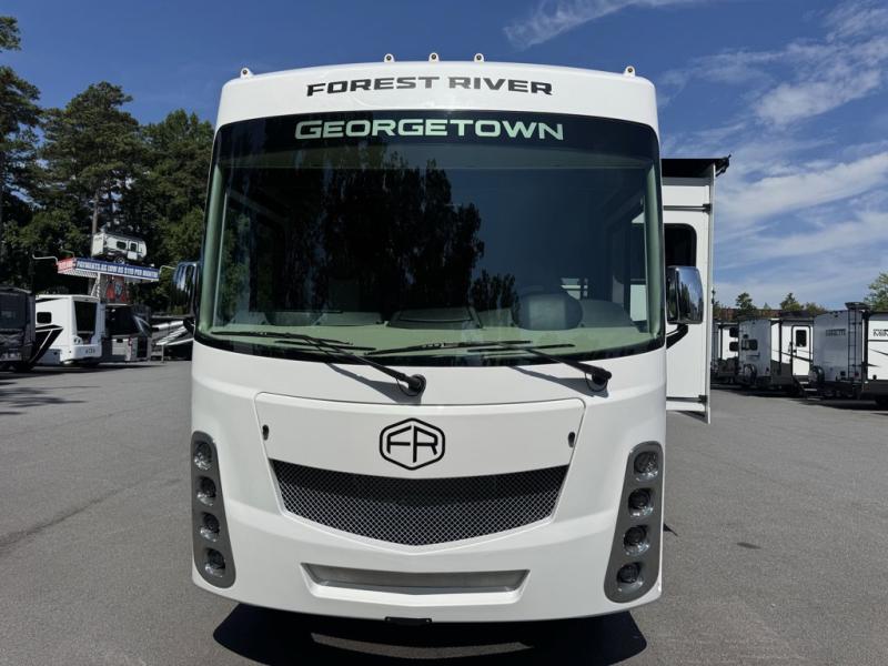 Forest River Georgetown 3 Series Class A gas motorhome 33B3 highlights: Bunk Beds, Rear Private Bedroom, Sofa with Tables, Passenger Workstation, Outside Entertainment, Power Overhead Bunk. Head to all of your favorite destinations in true comfort with this motorhome! Get a good night's rest on the king bed and keep your clothes looking their best with the wardrobes on either side of the dresser with a TV in the rear private bedroom. There is even a set of bunk beds for the kids to sleep on, plus the booth dinette and sofa with tables can transform into extra sleeping spaces. Everyone will stay squeaky clean with the two piece shower in the full bathroom, and their bellies full with the three burner cooktop, stainless steel 18 cu. ft. 3-door residential refrigerator and stainless steel microwave. If you need to get a little work done while you're away then you'll appreciate having a computer workstation at the passenger swivel captain seat! These Forest River Georgetown 3 Series Class A gas motorhomes have been engineered for the road and designed for the driver! Their construction consists of a multi-layered laminated roof system that includes tubular aluminum framing, a crowned fiberglass roof, and block foam insulation. The vacuum-bond laminated sidewalls not only have a gelcoat fiberglass exterior and tubular aluminum framing, but also EGS metal backers to increase the support for the interior cabinetry. With a hydraulic 4-point leveling system, you can be sure your unit will stay level everywhere you set up. The MORryde 1.5 tubular steel chassis up-fit will hold your unit together for years of fun. A few key features you will appreciate having include a 360 Plus Winegard WiFi to stay connected, a Sony 10" entertainment system to play your favorite tunes, and an exterior solar panel with a controller for off-grid capabilities. Come find your favorite one today!