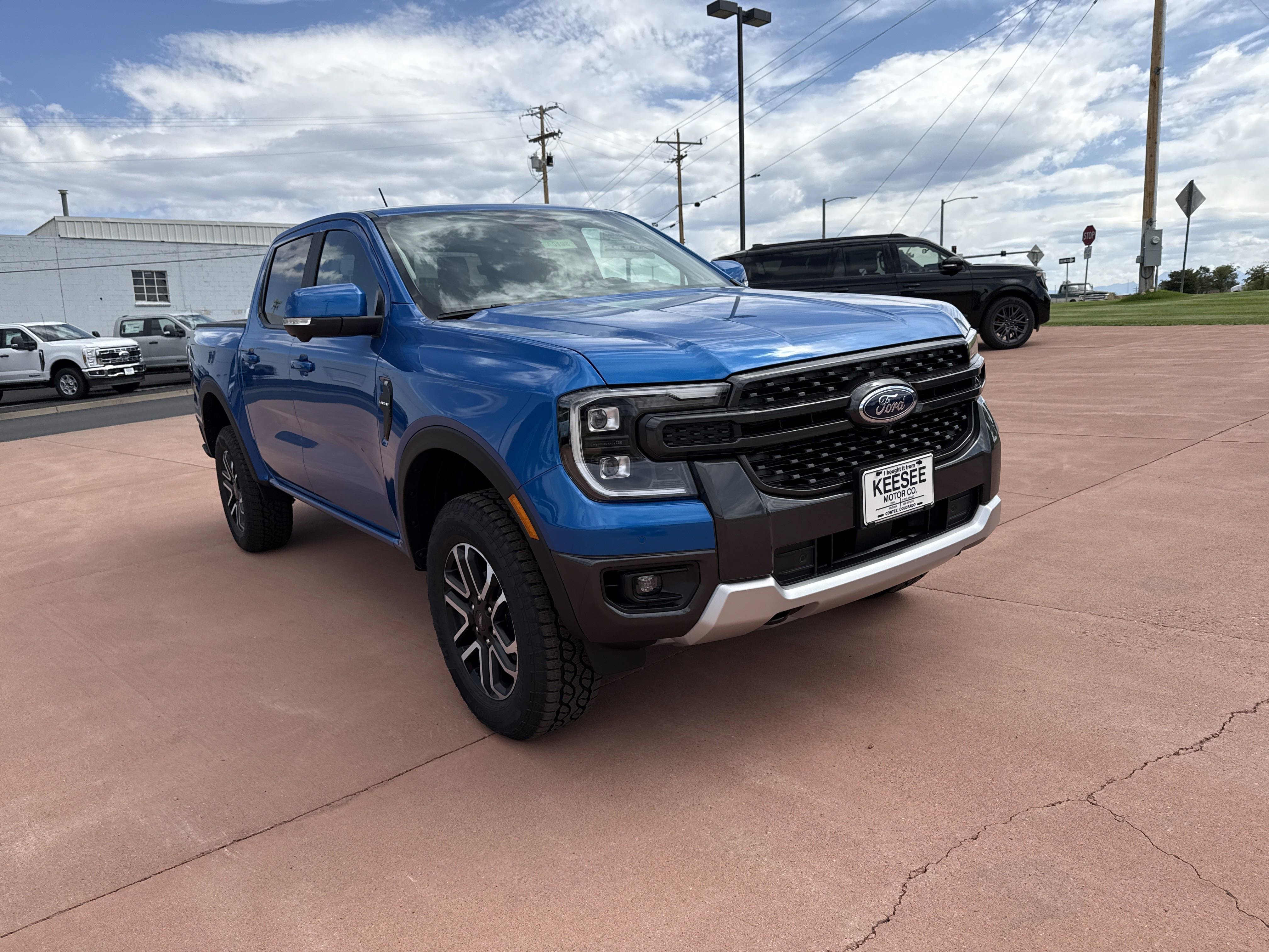 The 2025 Ford Ranger LARIAT® is a new, low-mileage vehicle that offers a blend of capability and comfort. With a powerful twin-turbo V-6 engine, advanced technology features, and a spacious SuperCrew body style, this truck is designed for both work and play. The Velocity Blue Metallic exterior is complemented by a range of interior materials and colors, providing a modern and stylish look. This vehicle is available at Keesee Motor Company in Cortez, CO.