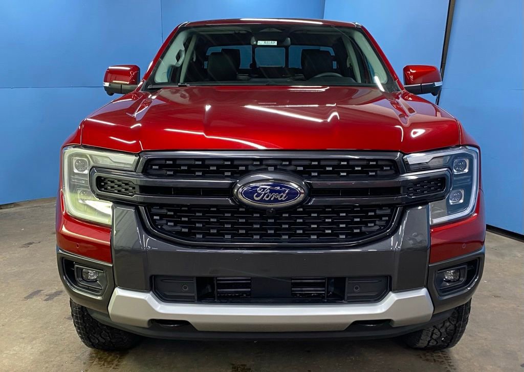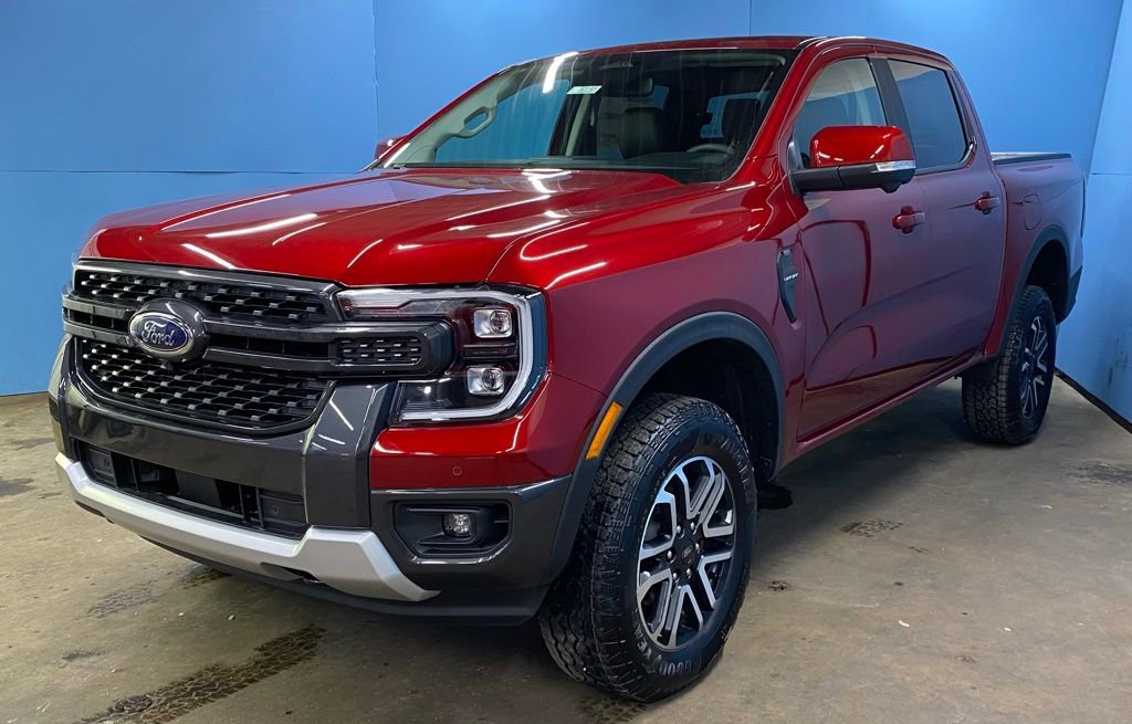 Recent Arrival! Ruby Red Metallic Tinted Clearcoat 2025 Ford Ranger Lariat 4WD 2.7L EcoBoost V6 10-Speed Automatic 4WD, 10 Speakers, 4-Wheel Disc Brakes, ABS brakes, Air Conditioning, Alloy wheels, AM/FM radio: SiriusXM, Auto High-beam Headlights, Auto-dimming Rear-View mirror, Automatic temperature control, Brake assist, Class IV Trailer Hitch Receiver, Compass, Delay-off headlights, Driver door bin, Driver vanity mirror, Dual front impact airbags, Dual front side impact airbags, Electronic Stability Control, Emergency communication system: SYNC 4 911 Assist, Equipment Group 500A Standard, Front anti-roll bar, Front Bucket Seats, Front Center Armrest, Front dual zone A/C, Front fog lights, Front reading lights, Front wheel independent suspension, Fully automatic headlights, Garage door transmitter, Gray Painted Center Bar & Grille Surround, Gray Painted Front Fascia & Rear Bumper, Heated door mirrors, Heated front seats, Heated steering wheel, Illuminated entry, Internet access capable: FordPass Connect 4G, Leather Shift Knob, Leather steering wheel, Leather-Trimmed Front Heated Bucket Seats, Low tire pressure warning, Memory seat, Navigation system: Connected Navigation, Occupant sensing airbag, Outside temperature display, Overhead airbag, Overhead console, Panic alarm, Passenger door bin, Passenger vanity mirror, Power door mirrors, Power driver seat, Power passenger seat, Power steering, Power windows, Radio: B&O Sound System by Bang & Olufsen, Rain sensing wipers, Rear reading lights, Rear seat center armrest, Rear step bumper, Rear window defroster, Remote keyless entry, Security system, SiriusXM Satellite Radio, Speed control, Speed-sensing steering, Sport Appearance Package, Sport Box Decal, Steering wheel mounted audio controls, SYNC 4A w/Connected Navigation, Telescoping steering wheel, Tilt steering wheel, Traction control, Trailer Tow Package, Tray Style Floor Liner, Trip computer, Turn signal indicator mirrors, Variably intermittent wipers, Voltmeter, Wheels: 18 Machined Aluminum w/Dark Pockets.