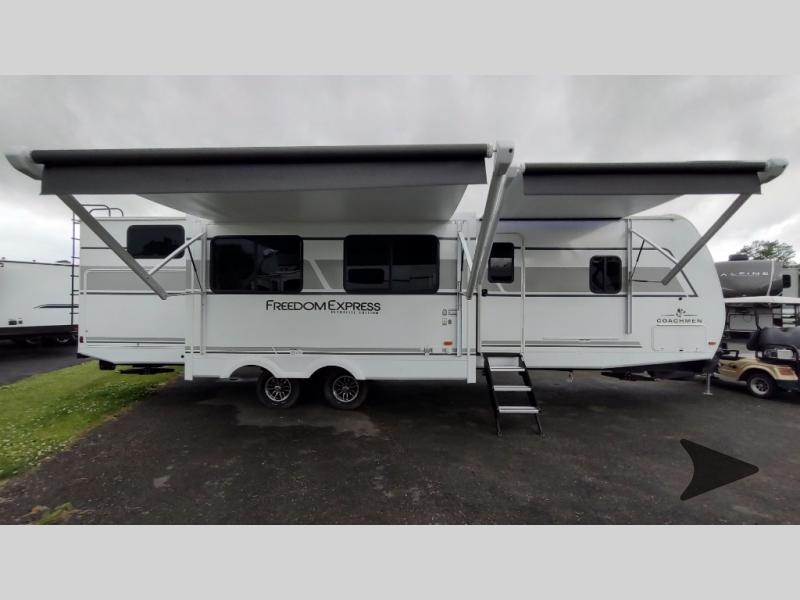 Coachmen Freedom Express Ultra Lite travel trailer 326BHDS highlights: Bunkhouse, Fireplace, Power Awnings with LED Lights, Front Queen Bedroom, Camp Kitchen. You will love taking a big group camping in this spacious travel trailer! The rear bunkhouse offers a flexible space with bunks plus a roll-over sofa. A half bath in the bunkhouse is ultra convenient, while the full bath includes a 30" x 36" shower. At the front you will enjoy privacy in the queen bedroom, which has vaulted underbed storage, dual wardrobes, plus a linen closet with its own laundry bag for extra convenience. Everyone will want to gather in the living area with its entertainment center with fireplace. The hide-a-bed sofa offers even more sleeping space or swap it out for the optional theater seats for extra relaxation. The kitchen is well-equipped, and the 76" dinette booth will have plenty of room. There's an outdoor camp kitchen as well if you'd prefer to cook outside. With any Freedom Express Ultra Lite travel trailer by Coachmen you will appreciate quality construction materials, such as vacuum bonded walls with Azdel composite, a 3/4 gel coated fiberglass cap with an automotive glass windshield, and a heated enclosed underbelly. Each model also features Tufflex PVC roofing, front rock guard, and E-Z Lube axles for smooth towing. Inside, you'll find kitchen backsplash, hidden hinge cabinetry, and wear-resistant vinyl flooring throughout. The power tongue jack included with the Ultra Lite Express Package will make set-up a breeze, and each model includes back-up camera prep and they are Freedom solar ready if you plan to go off-grid. Enjoy lightweight camping with a Freedom Express Ultra Lite travel trailer today!