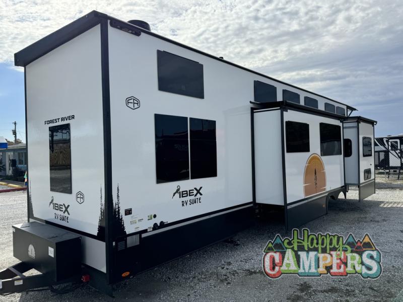 Forest River IBEX RV Suite travel trailer RVS3 highlights: Dual Bath Sinks, Double Slides, Rear Sun Deck, Bedroom Fireplace, Loft with Stairs, Island with Six Chairs. This travel trailer with a loft will be perfect for those who love to camp with friends and family! There are dual entry doors, one of which leads onto the rear sun deck and into the rear bedroom. Here, you'll find a king bed slide out with storage, a dresser and a desk with a chair, plus a bedroom fireplace. Your crew will love to sit around the uniquely-shaped kitchen island with six chairs, plus there is a luxury lounge here for more seating space. The kitchen pantry lets you store all your favorite goodies, and the entertainment center gives the option to watch movies. At night, your guests can head up the stairs to the loft with two 40" x 74" bunks and a dresser, and the front bath will let everyone stay clean throughout your trip. Dual bath sinks and a waterfall shower add luxury to this space, plus there is an optional washer/dryer combo if you want the option to make laundry day easier! If you're looking for a more home-like travel trailer, the IBEX RV Suite by Forest River may just be perfect for you! The minute you step through the sliding glass patio doors, you will be met with luxurious features. There is a premium Bluetooth audio system in each model, plus a luxury lavatory, solid surface kitchen countertops, and a king suite. You will love the inviting dimmable sunset lighting, and the central vacuum system will make it easier than ever to clean up. Each model is constructed with a gel coat fiberglass and durable Azdel, and the upgraded sidewall insulation will help extend your camping season. All-terrain tires also come standard to make towing easier, and the sleek tinted frameless windows provide more open views!