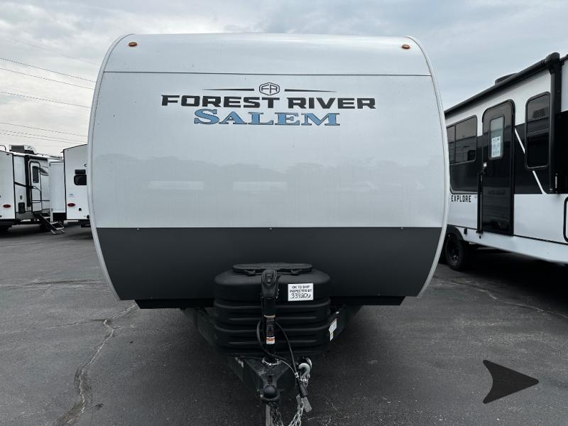 Forest River Salem travel trailer 27RK highlights: Rear Kitchen. Oversized Refrigerator. Fireplace. Large Slide Out. 20' Power Awning. With a spacious kitchen and panoramic windows, this travel trailer is sure to stand out! The L-shaped sofa, dual lounge chairs, and Versa Flex table give you many seating options. You can either cook a delicious meal in the rear kitchen or you can use the exterior camp kitchen to breathe in some fresh air while you cook. After a fun-filled day, you can rinse off in the walk-in shower then head to the front private bedroom, grab your pajamas from the closet, and lay down on the custom king bed with Versa Tilt for a good night's rest! The Salem travel trailers are packed with hassle-free camping amenities! There are a variety of floorplans to choose from between three different regions. The heated and enclosed Accessibelly will help protect against the elements and debris during transport, and the exterior retro/metal redesign is sure to be eye-catching! There are stylish roller shades inside, along with updated backsplash, elegant curtain rods and curtains, plus many more interior comforts! Choose a Salem travel trailer today for quality and value!