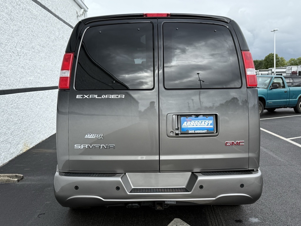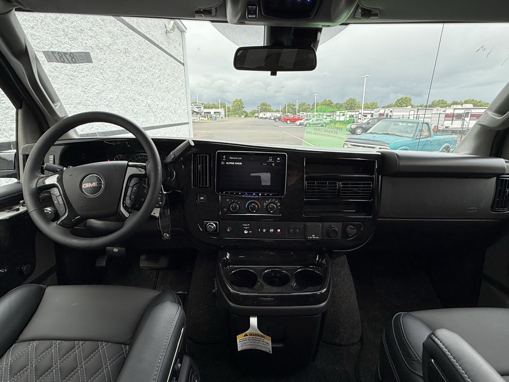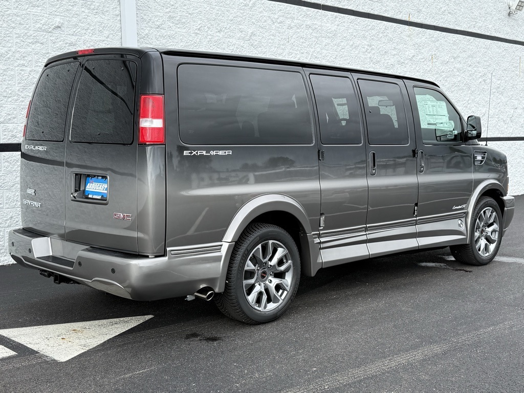 2025 GMC Savana Conversion by Explorer Van Company! Exterior: Black/Grey Fade Paint, Powered Running Boards, Low Top, Chrome Mesh Grille. Interior: Two-Tone Black Diamond-Stitched Leather, Hi-Gloss Wood Accents & Trim, 4 Captains Chairs, Air Conditioner/Rear Air. Body: GMC Savana 2500 with Seating for 7 Passengers Extended, Keyless/Power Locks. Engine: 6.6L V8. Doors: Cab Doors (1 per side), Mid Doors (Passenger side), Rear Doors (2). Front Seating: Captains Chairs, Power Seating, Premium Heated Leather Seats. Mid Seating: Captains Chairs, Premium Leather. Rear Seating: 3-Piece Power-Sliding Rear Sofa/Bed. Features: AM/FM/SiriusXM Stereo, Back-up Camera, Steering Wheel Controls, Tilt, Cruise, 32 Inch TV, Blu-ray Player, Wireless Headphones, Sunroof. Wheels: 20 Inch. Towing Package: Class III.