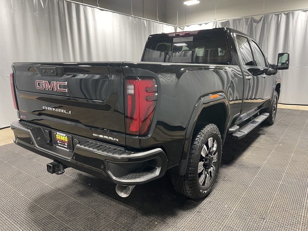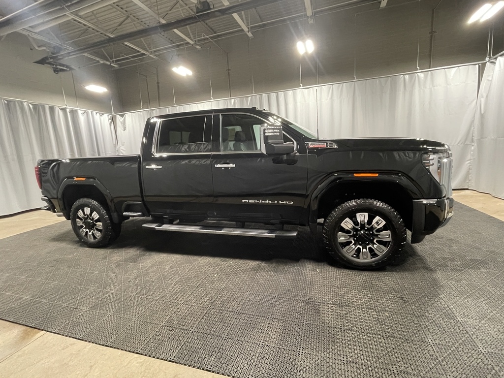 Onyx Black 2025 GMC Sierra 2500HD Denali 4WD 10-Speed Automatic Duramax 6.6L V8 Turbodiesel 10-Speed Automatic, 4WD, Jet Black Leather, 12-Way Power Driver Seat Adjuster with Lumbar, 12-Way Power Passenger Seat Adjuster with Lumbar, and a list of features. The vehicle features a description of the vehicle's features and options. The vehicle is equipped with a Duramax 6.6L V8 Turbodiesel engine, Allison 10-speed automatic transmission, and a range of premium features including leather seats, navigation, and a sunroof.