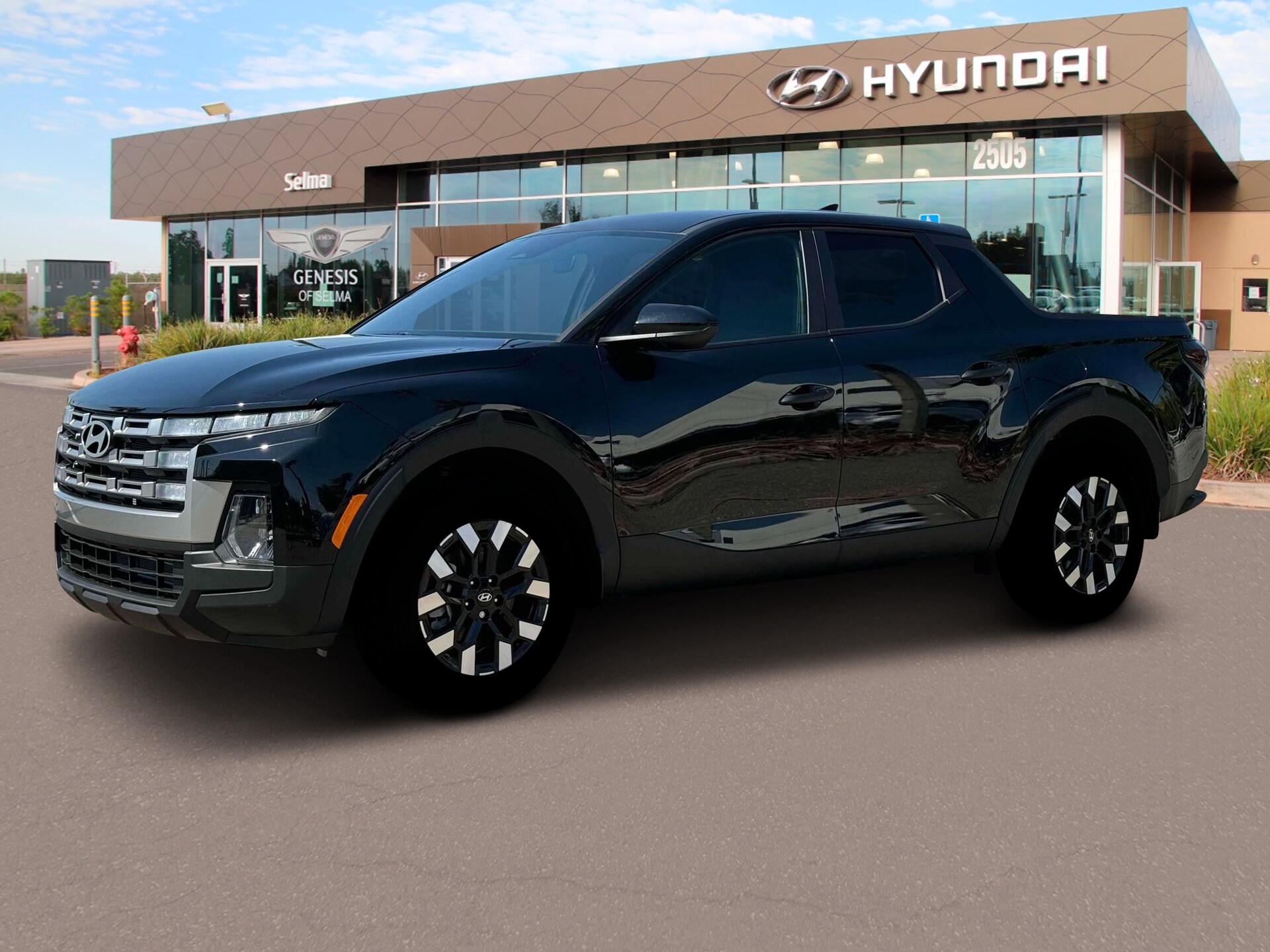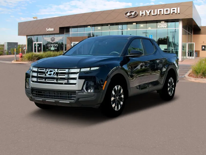The 2025 Hyundai Santa Cruz SE FWD is a new truck with a 8-speed automatic transmission. It features lane departure warning, emergency communication system, and wireless phone connectivity. The exterior is phantom black with a gray interior.