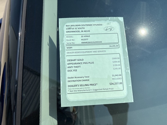 2025 Hyundai Venue SEL Intense Blue FWD CVT I4 29/32 City/Highway MPG. Since first opening our doors, Ray Skillman Southside Hyundai has been proud to serve Indianapolis, Greenwood and Franklin drivers. Our firm commitment to top-notch customer service has situated us as a leading area Hyundai dealer, and this is what keeps our customers coming back time and again. We offer a wide selection of vehicles and are excited to help you find a car that's tailored to your specific needs. Call or text 317-885-2300 to schedule your test drive today! All offers shown do not include tax, title, $251 doc/compliance fee, and $299 theft charge.