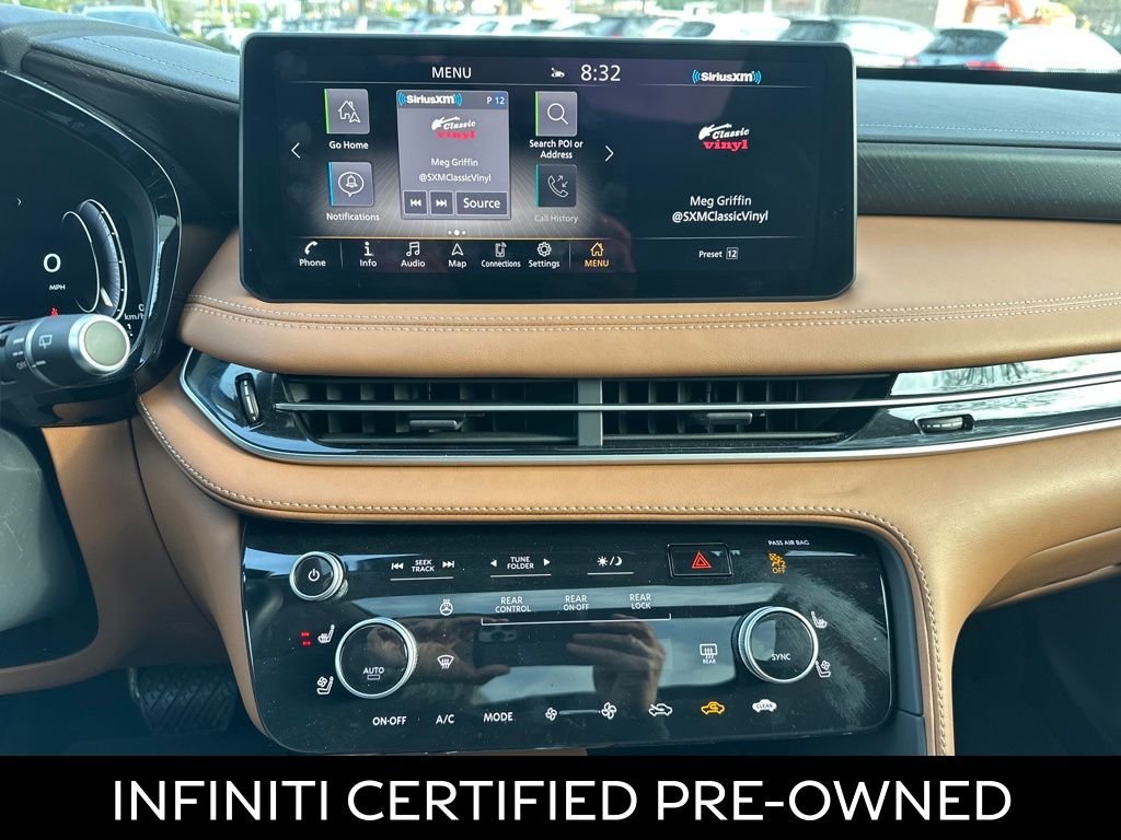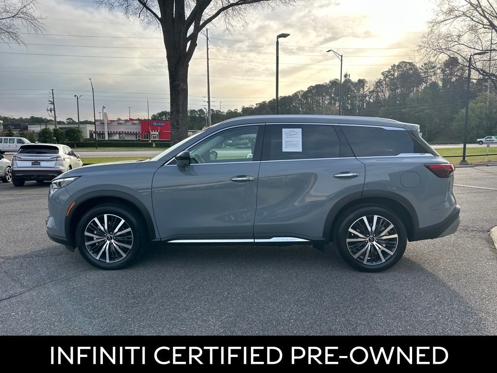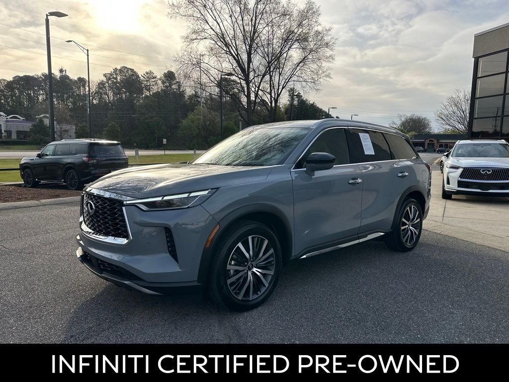 This 2025 INFINITI QX60 Sensory in Harbor Gray comes with the following features: 2.0L I4 Turbocharged DOHC 16V LEV3-ULEV50 268hp 9-Speed Automatic AWD. This vehicle is a manager special - price not a misprint - this month only! Bought here, serviced here, we have all records. Factory certified pre-owned vehicle. Heads up display. Heated and cooled front leather seats. Heated front leather seats. Heated rear leather seats. Keyless entry. Moonroof. Navigation. Panoramic moonroof. Power folding mirrors. Power windows, locks and mirrors. Premium audio. Premium stereo. Premium wheels. Push button start. Rear view back-up camera. Remote start.