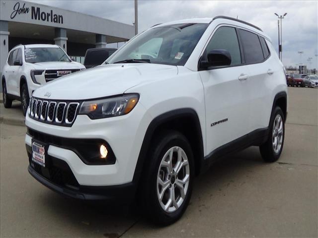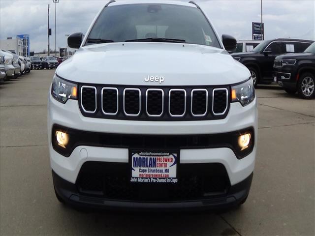 The 2025 Jeep Compass Latitude is a preowned vehicle with a turbocharged 4-cylinder engine and a full-time 4WD system. It features a bright white exterior and a comfortable interior with modern technology and safety features. The vehicle is available at Morlan Chrysler LLC. in Cape Girardeau, MO.
