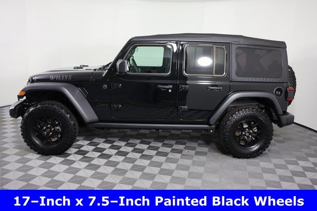 Bluetooth, Backup Camera, Keyless Entry, Apple CarPlay. 2025 Jeep Wrangler Willys Black Clearcoat. Odometer is 2972 miles below market average!