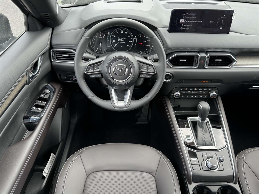 Machine Gray 2025 Mazda CX-5 2.5 Turbo Signature features Active Driving Display, Rear Cross Traffic Alert, and Lane Keep Assist/Lane Departure Warning. The vehicle is equipped with a navigation system, heated and ventilated front seats, heated rear seats, heated steering wheel, and Nappa Leather Seat Trim. It also includes a power moonroof, power liftgate, and a premium sound system. The engine is a 2.5L SKYACTIV-G Dynamic Pressure Turbo, and the drivetrain is all-wheel drive.