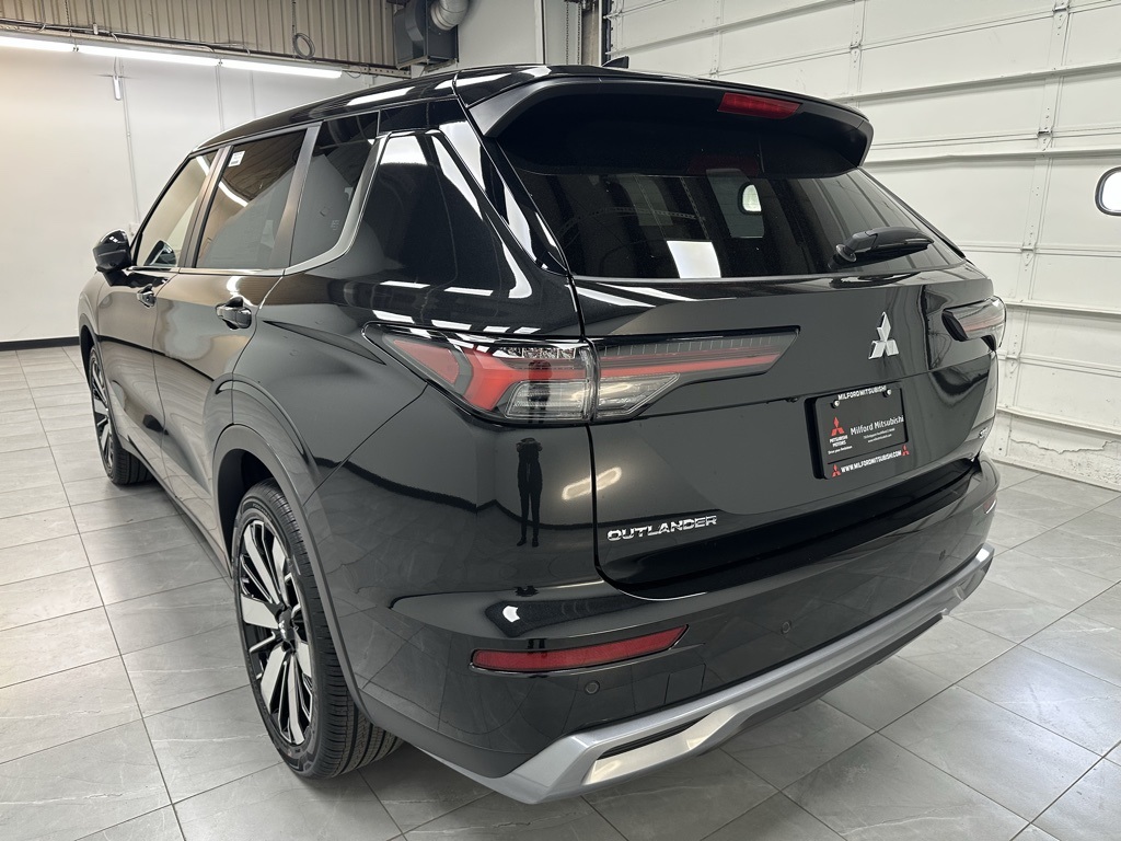 Black 2025 Mitsubishi Outlander SE 4WD CVT 2.5L I4 DOHC 16V LEV3-ULEV50 181hp\n24/30 City/Highway MPG\n3rd row seats:\n4-Wheel Disc Brakes\n8 Speakers\nABS brakes\nAir Conditioning\nAlloy wheels\nAndroid Auto & Apple CarPlay\nAuto High-beam Headlights\nExterior Parking Camera Rear\nFront fog lights\nFully automatic headlights\nHeated front seats\nLane Departure Warning\nNavigation System\nturn signal indicator mirrors\ngroup Key Features list omitted for brevity.