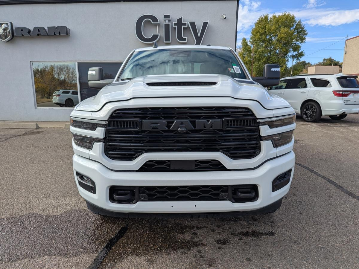 Introducing the formidable 2025 RAM 3500 Laramie Crew Cab Night Edition 4x4, a truly exceptional heavy-duty pickup that masterfully blends robust capability with unparalleled luxury and a commanding, dark aesthetic. Presented in a sleek Bright White exterior with a bold Black interior featuring premium leather-faced bucket seats, this truck makes a powerful statement wherever it goes. At its core, this Laramie is powered by the legendary 6.7L Cummins i-6 HO turbocharged diesel engine, delivering immense power and unwavering reliability for the most demanding tasks. This formidable engine is seamlessly paired with an 8-speed TorqueFlite HD automatic transmission, ensuring smooth, responsive shifts and optimal power delivery. The 3.42 axle ratio further enhances its towing and hauling prowess, making it a supreme workhorse ready for anything. This RAM 3500 truly stands out with the exclusive Night Edition package, giving it an aggressive, monochromatic look. It's further enhanced by the Laramie Level 2 Equipment Group, which elevates the luxury and technology to new heights. Enjoy a cutting-edge experience with the Uconnect 5 NAV system featuring a massive 12-inch display, offering integrated GPS navigation, Google Android Auto, and Apple CarPlay capable. The 17-speaker harman/kardon premium sound system delivers an immersive audio experience, complemented by a dual wireless charging pad to keep your devices powered. Comfort is paramount, with power 8-way adjustable driver and features. Experience personalized comfort with heated and ventilated front seats.