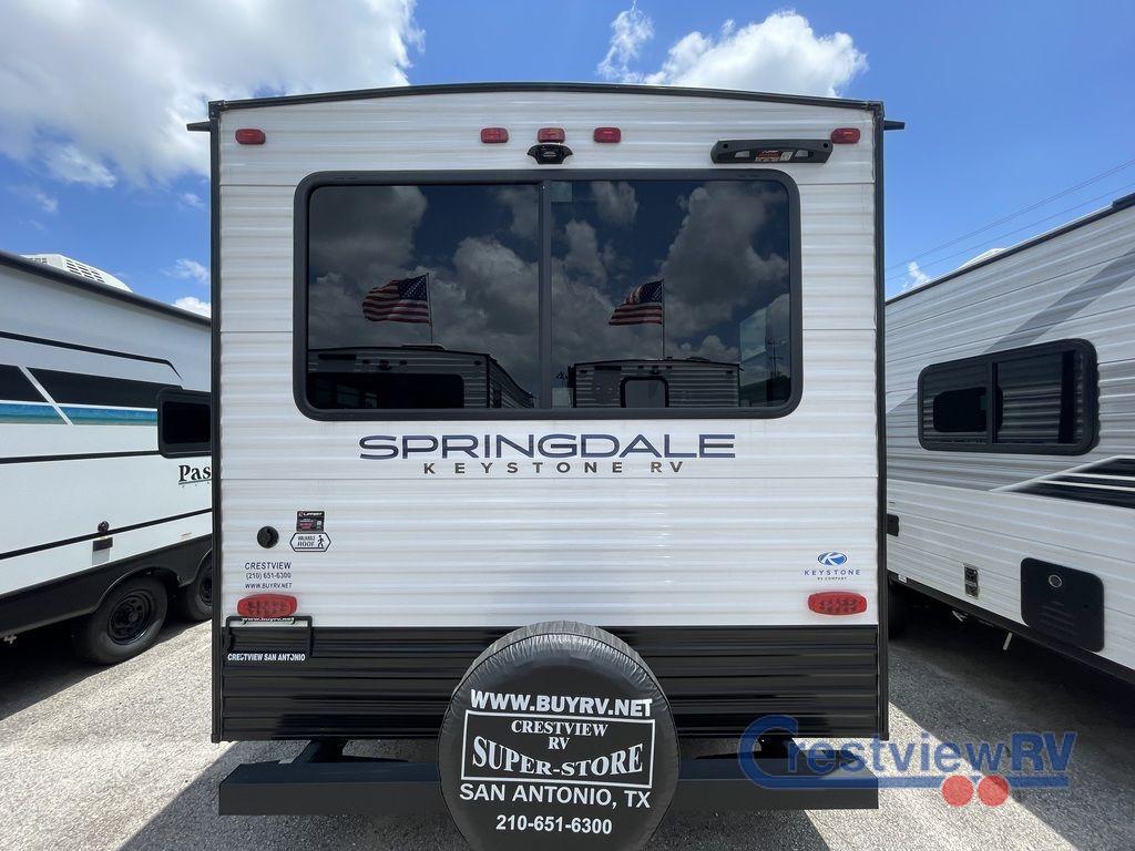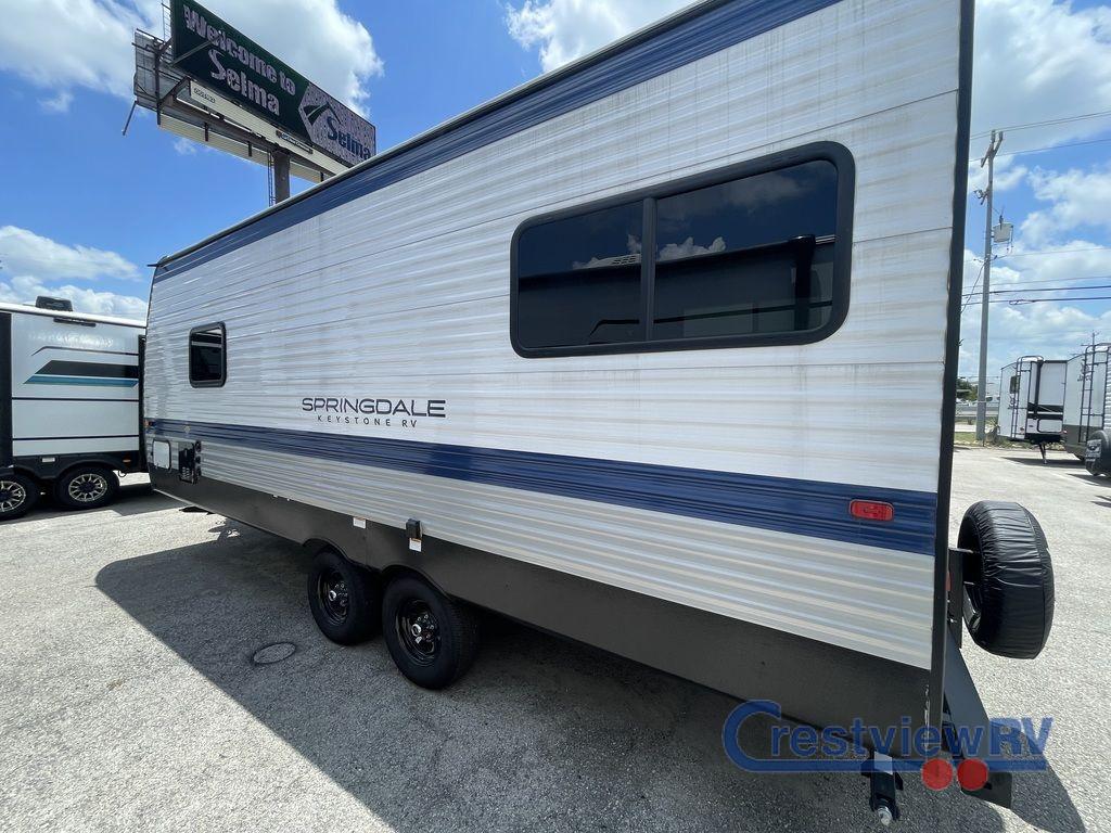 Keystone Springdale Classic travel trailer 200RLC highlights: Full Bath, Kitchen Pantry, Sofa, Exterior Pass-Through. This trailer is perfect for your crew of four to six. There is a queen bed in the semi-private bedroom, along with dual closets and nightstands to keep your things tidy. You can dine each day on the booth dinette, relax on the sofa, and house additional guests here at night. The kitchen includes everything you need to prepare meals each day, including a gas range, microwave, and a 10 cu. ft. 12V refrigerator for cold items. And the full bath on board lets you stay clean throughout each camping trip! The Springdale Classic travel trailers by Keystone will provide you and your family many great outdoor experiences and it will also be kind to your pocketbook. Each one is constructed with an aluminum exterior, a walkable roof, and an I-beam frame with stamped steel cross-members and outriggers for added strength. There are also heavy duty stabilizer jacks and power tongue jacks outside, along with an XL entry assist handle for added convenience. Each travel trailer includes LED lighting, bedside outlets, and blackout night shades inside that will provide you with more privacy at night.